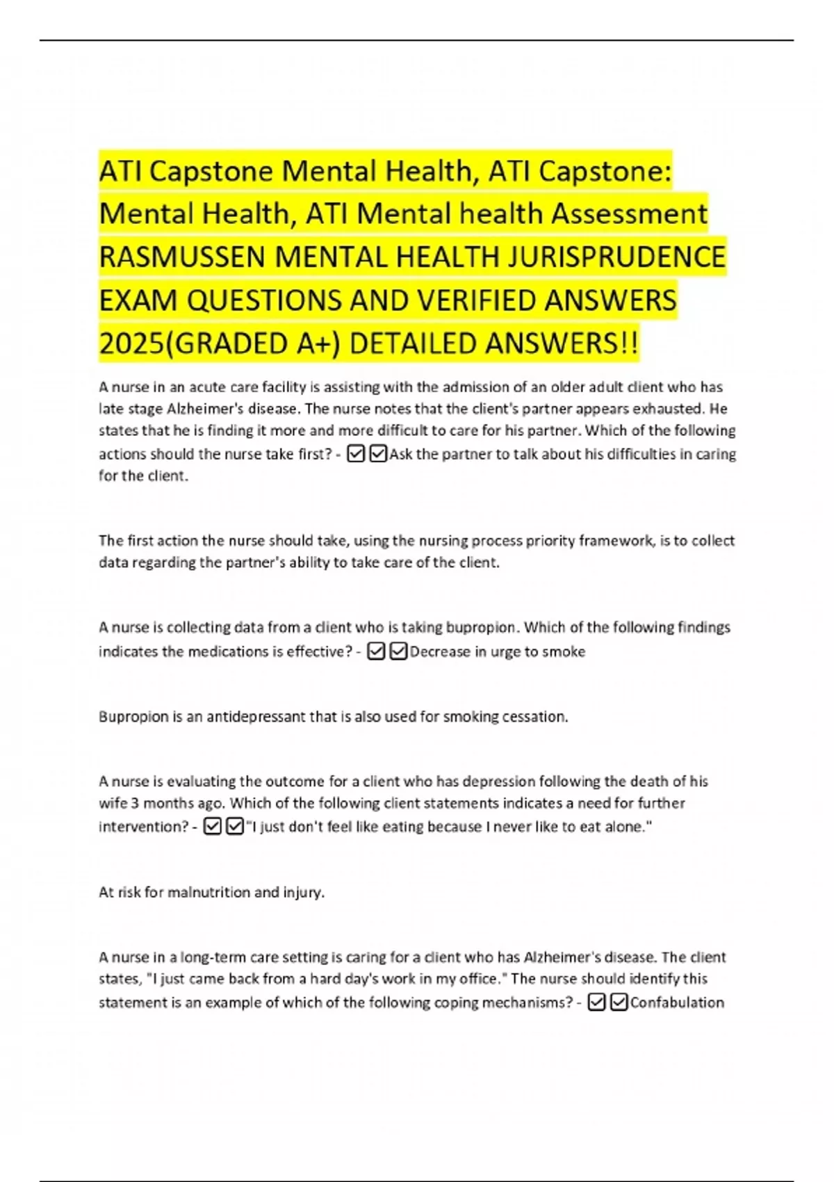 ATI Capstone Mental Health, ATI Capstone: Mental Health, ATI Mental health Assessment RASMUSSEN MENTAL HEALTH JURISPRUDENCE EXAM QUESTIONS AND VERIFIED ANSWERS 2025(GRADED A+) DETAILED ANSWERS!! A nurse in an acute care facility is assisting with the admission of an older adult client who has late stage Alzheimer's disease. The nurse notes that the client's partner appears exhausted. He states that he is finding it more and more difficult to care for his partner. Which of the following actions should the nurse take first? -Ask the partner to talk about his difficulties in caring for the client. The first action the nurse should take, using the nursing process priority framework, is to collect data regarding the partner's ability to take care of the client. A nurse is collecting data from a client who is taking bupropion. Which of the following findings indicates the medications is effective? - Decrease in urge to smoke