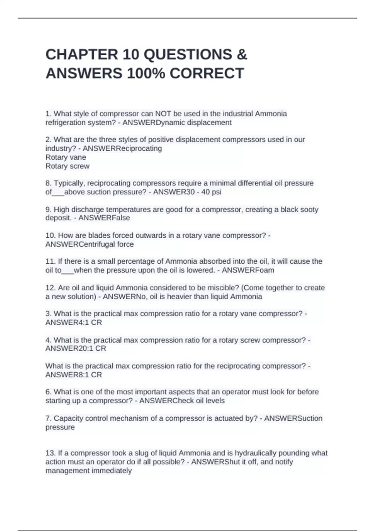 1. What style of compressor can NOT be used in the industrial Ammonia refrigeration system? - ANSWERDynamic displacement 2. What are the three styles of positive displacement compressors used in our industry? - ANSWERReciprocating Rotary vane Rotary screw 8. Typically, reciprocating compressors require a minimal differential oil pressure of___above suction pressure? - ANSWER30 - 40 psi 9. High discharge temperatures are good for a compressor, creating a black sooty deposit. - ANSWERFalse