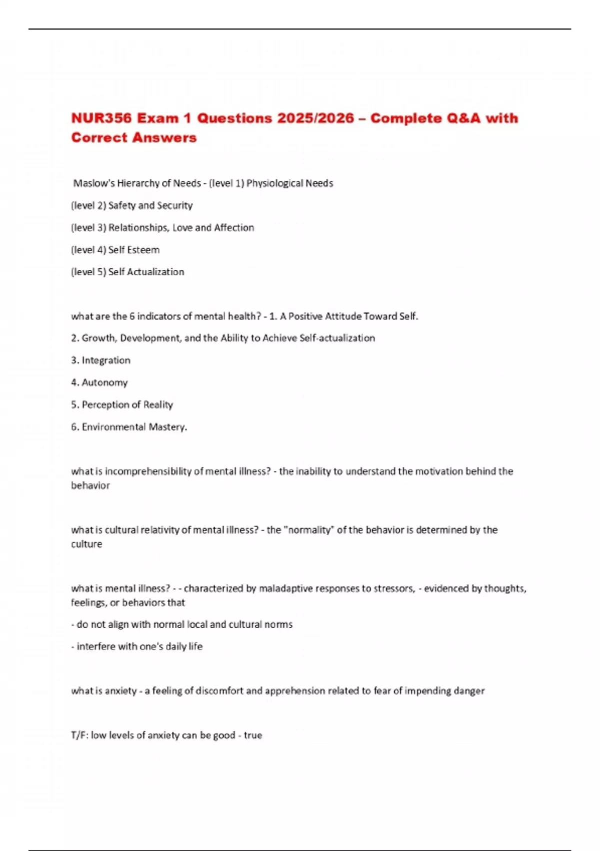 NUR356 Exam 1 Questions 2025/2026 – Complete Q&A with Correct Answers