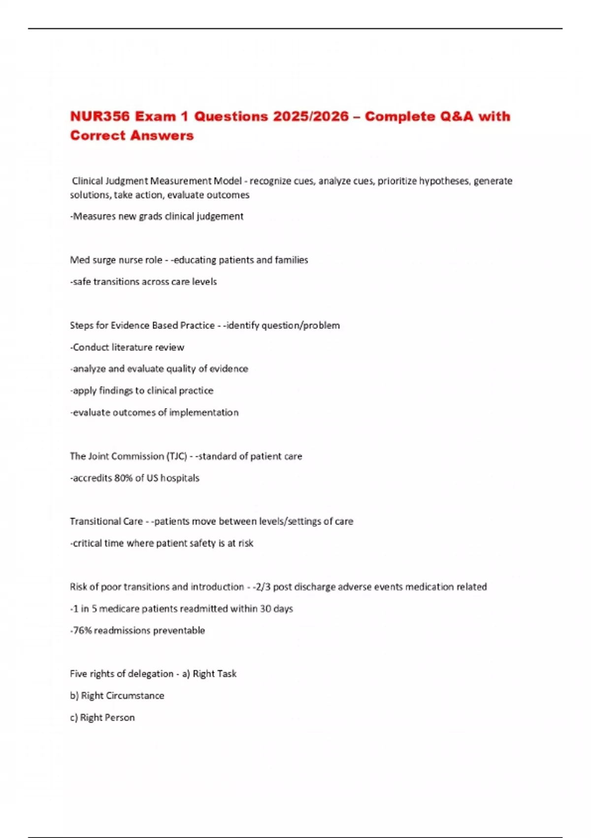 NUR356 Exam 1 Questions 2025/2026 – Complete Q&A with Correct Answers