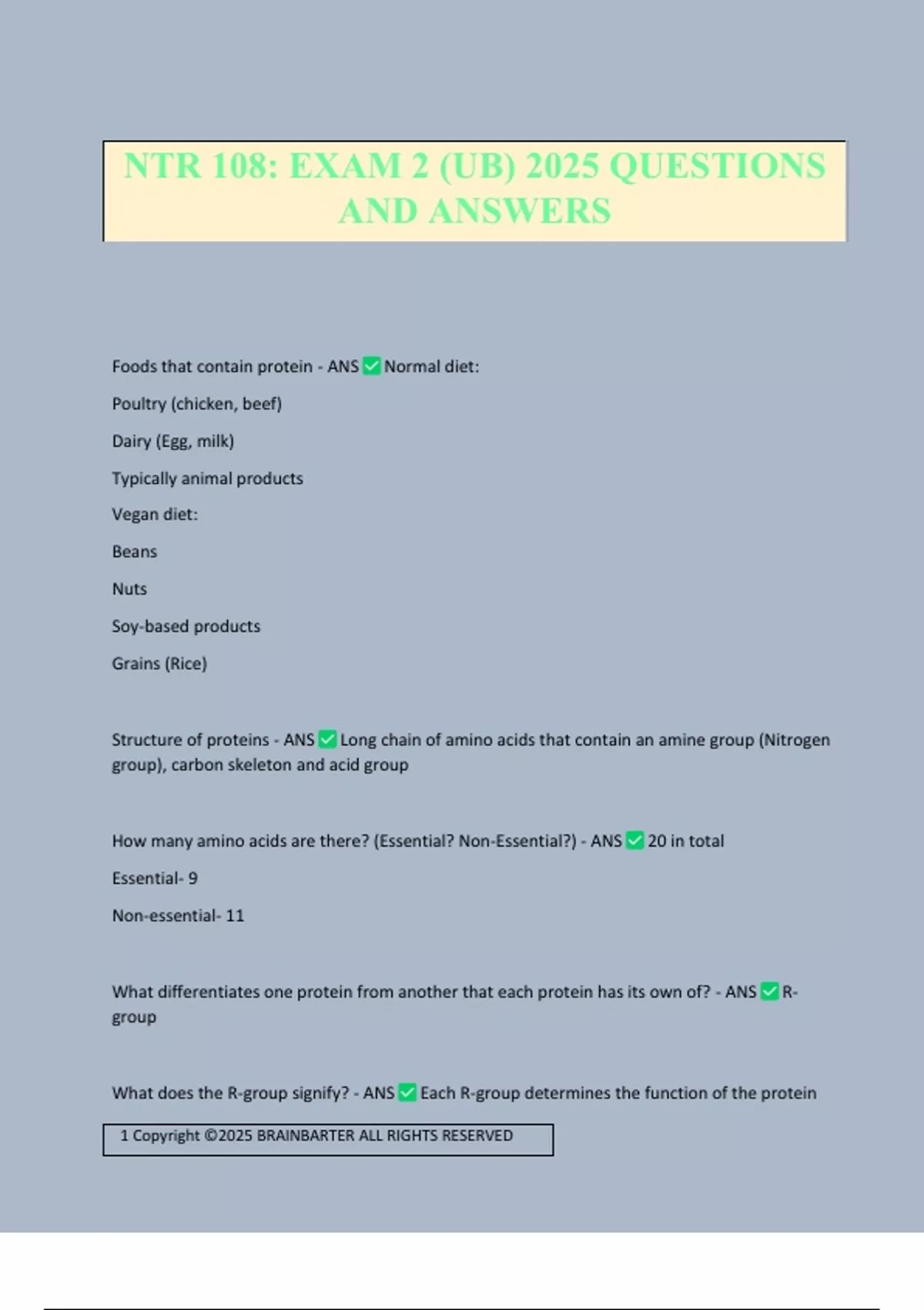 Foods that contain protein - ANS Normal diet: Poultry (chicken, beef) Dairy (Egg, milk) Typically animal products Vegan diet: Beans Nuts Soy-based products Grains (Rice) Structure of proteins - ANS Long chain of amino acids that contain an amine group (Nitrogen group), carbon skeleton and acid group How many amino acids are there? (Essential? Non-Essential?) - ANS 20 in total Essential- 9 Non-essential- 11 What differentiates one protein from another that each protein has its own of? - ANS R- group What does the R-group signify? - ANS Each R-group determines the function of the protein NTR 108: EXAM 2 (UB) 2025 QUESTIONS AND ANSWERS 2 Copyright ©2025 BRAINBARTER ALL RIGHTS RESERVED Peptide Bond - ANS Bond that links 2 amino acids Broken during digestion Dipeptide - ANS two amino acids Polypeptide - ANS Many amino acids (most our food contains this) What determines the structure and function of polypeptide? - ANS Specific amino acid sequence What is an example of a specific amino acid sequence? - ANS Insulin- made from 51 amino acids What does the body need to make the proteins' sequence and from where? - ANS The body needs a blueprint for the protein which comes from our DNA that is transported by mRNA from the nucleus. Structural Description of Proteins - ANS Proteins are complex in that they have a # of amino acids that may bend and twist with another amino acid Is protein an essential nutrient? - ANS Yes, protein is an essential nutrient. Where does the body get the Nitrogen to make non-essential amino acids? - ANS Takes the Nitrogen from essential amino acids and makes NEAA, which can be used as energy. NEAA - ANS Made from EAA and can also be used as energy. 3 Copyright ©2025 BRAINBARTER ALL RIGHTS RESERVED Functions of Proteins (Structurally) - ANS Structurally it helps in the making of hair, skin, especially muscle Function of Protein (Growth)*** - ANS Growth*** anyone who is going through a growing phase (infant, teenager going through puberty, pregnancy) will need a lot of protein Function of Protein (Tissue) - ANS Maintenance and repair of body tissues (a cut has to heal and healing requires a protein called fibrin that clots the area) Function of Protein (Energy) - ANS 4kcals/g Minor role*** because that is the main role of carbs and fats (10% proteins, 90% fats/carbs) Function of Proteins (Hormones) - ANS Regulation of fluid balance (edema)- protein brings back the fluid into the blood Helps with blood clotting (fibrin) Transports protein, like lipoproteins*** ^ If we didn't have this protein we wouldn't be able to move fat around the body Function of Proteins (Enzymes) - ANS Help in digestion mainly Function of Proteins (Immune Functions) - ANS Antibodies*** Protein Digestion - ANS Stomach- acid*** of stomach is going to straighten bonds to expose bonds in the protein Small Intestine-
