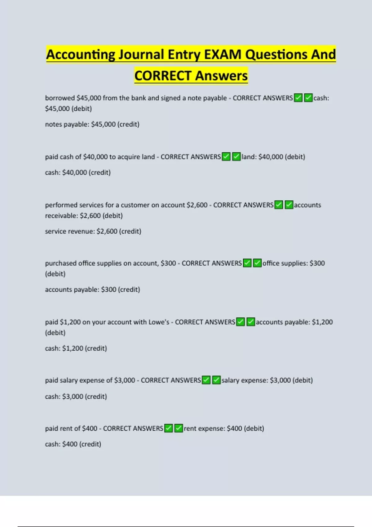 Accounting Journal Entry EXAM Questions And CORRECT Answers borrowed $45,000 from the bank and signed a note payable - CORRECT ANSWERS $45,000 (debit) notes payable: $45,000 (credit) paid cash of $40,000 to acquire land - CORRECT ANSWERS cash: $40,000 (credit) land: $40,000 (debit) performed services for a customer on account $2,600 - CORRECT ANSWERS receivable: $2,600 (debit) service revenue: $2,600 (credit) purchased office supplies on account, $300 - CORRECT ANSWERS (debit) accounts payable: $300 (credit)