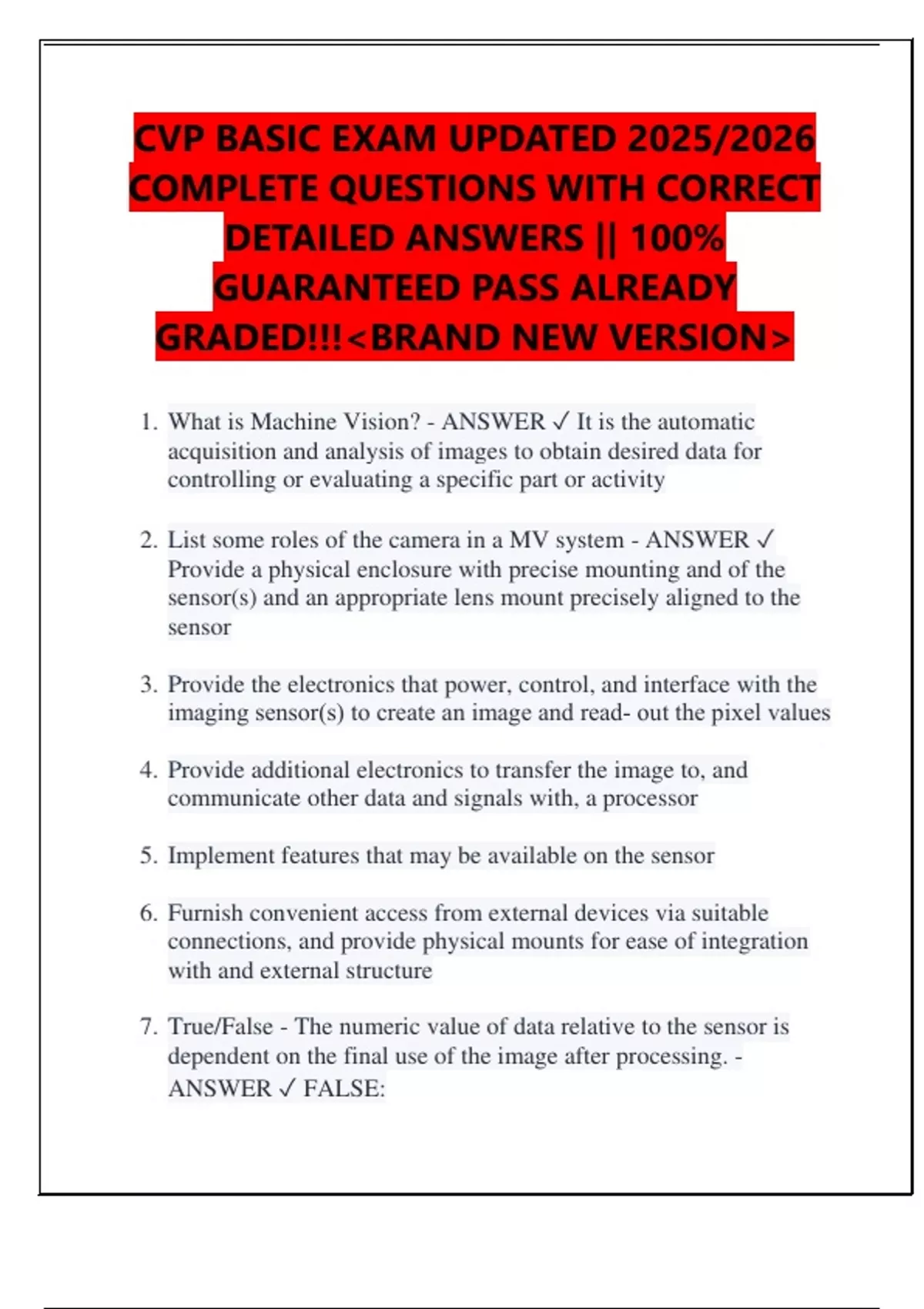 CVP BASIC EXAM UPDATED 2025/2026 COMPLETE QUESTIONS WITH CORRECT DETAILED ANSWERS || 100% GUARANTEED PASS ALREADY GRADED!!!&lt;BRAND NEW VERSION&gt; 1. What is Machine Vision? - ANSWER It is the automatic acquisition and analysis of images to obtain desired data for controlling or evaluating a specific part or activity 2. List some roles of the camera in a MV system - ANSWER Provide a physical enclosure with precise mounting and of the sensor(s) and an appropriate lens mount precisely aligned to the sensor 3. Provide the electronics that power, control, and interface with the imaging sensor(s) to create an image and read‐ out the pixel values 4. Provide additional electronics to transfer the image to, and communicate other data and signals with, a processor 5. Implement features that may be available on the sensor 6. Furnish convenient access from external devices via suitable connections, and provide physical mounts for ease of integration with and external structure 7. True/False - The numeric value of data relative to the sensor is dependent on the final use of the image after processing. - ANSWER FALSE: 8. regardless of the final use of the image after processing, the numeric value of data relative to the sensor is always a single number representing the amount of EM energy collected by that pixel over a specific exposure duration. 9. How do filters work {to create a color image}? 10. (Bayer Pattern Filter) - ANSWER Incoming visible illumination is filtered to allow only a specific broad color range through to each pixel. 11. Each pixel contains a numeric value for that color range. 12. What is "de-Bayering"? 13. (also, describe how it works) - ANSWER A process in which viewable images can be made from the data. 14. Neighboring pixels are processed ("de‐Bayering") and combined so that each pixel has a calculated R, G, B value - creating a color image. 15. True/False - Non‐visible imaging (Infrared ‐ IR) is NOT a part of the electromagnetic spectrum. - ANSWER FALSE 16. see wavelength (EM) chart 17. What is the key difference for non‐visible imaging (Infrared ‐ IR) with regards to the SENSOR? - ANSWER These styles of sensors are made with different types of material vs. standard visible range sensors which use silicon. 18. TRUE/FALSE 19. All images when acquired by a sensor and 2D camera are "2 dimensional" - a planar view of reflected or emitted light/energy. - ANSWER TRUE 20. Name some techniques (excluding ToF, Lidar/Radar/Sonar) for 3D imaging using 2D.