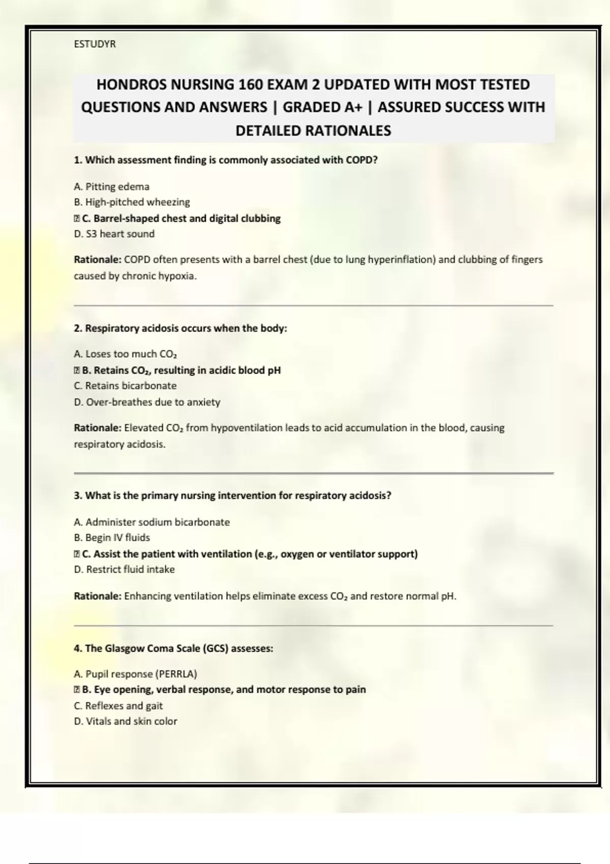 HONDROS NURSING 160 EXAM 2 UPDATED WITH MOST TESTED