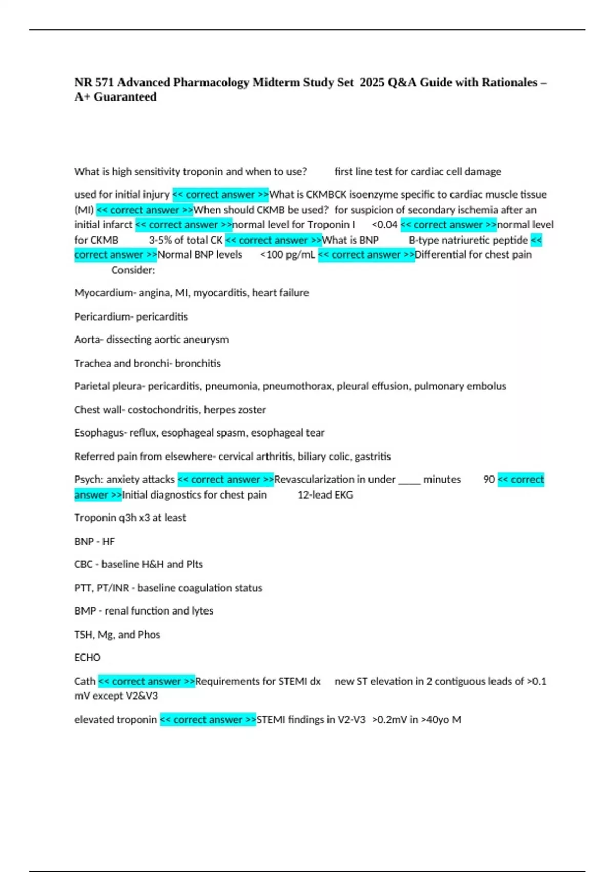 correct answer >>Normal BNP levels <100 pg/mL << correct answer >>Differential for chest pain