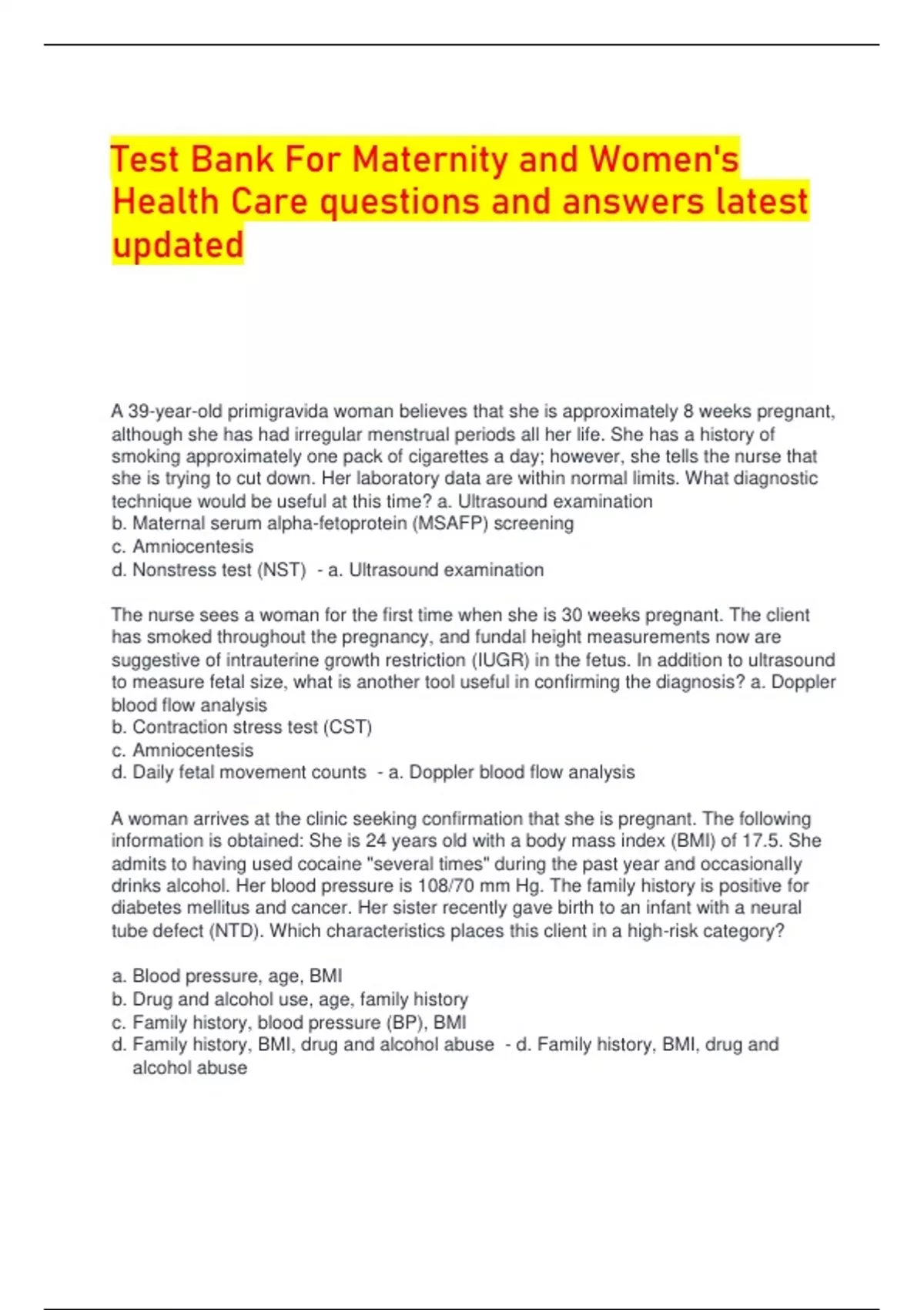 Test Bank For Maternity and Women's Health Care questions and answers latest updated