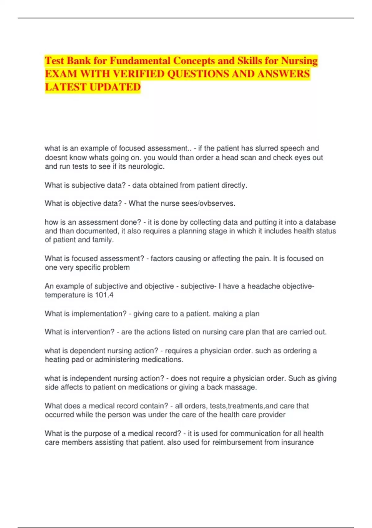 Test Bank for Fundamental Concepts and Skills for Nursing EXAM WITH VERIFIED QUESTIONS AND ANSWERS LATEST UPDATED