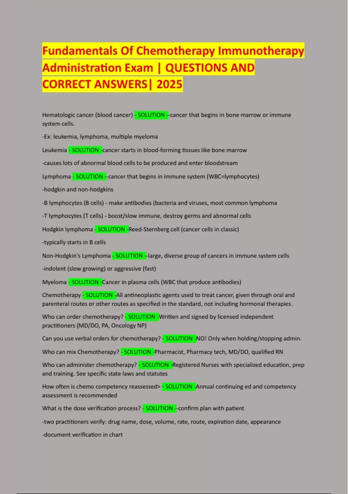 Fundamentals Of Chemotherapy Immunotherapy Administration Exam | QUESTIONS AND CORRECT ANSWERS| 2025 Hematologic cancer (blood cancer) - SOLUTION --cancer that begins in bone marrow or immune system cells. -Ex: leukemia, lymphoma, multiple myeloma Leukemia - SOLUTION -cancer starts in blood-forming tissues like bone marrow -causes lots of abnormal blood cells to be produced and enter bloodstream Lymphoma - SOLUTION --cancer that begins in immune system (WBC=lymphocytes) -hodgkin and non-hodgkins -B lymphocytes (B cells) - make antibodies (bacteria and viruses, most common lymphoma -T lymphocytes (T cells) - boost/slow immune, destroy germs and abnormal cells Hodgkin lymphoma - SOLUTION -Reed-Sternberg cell (cancer cells in classic) -typically starts in B cells Non-Hodgkin's Lymphoma - SOLUTION --large, diverse group of cancers in immune system cells