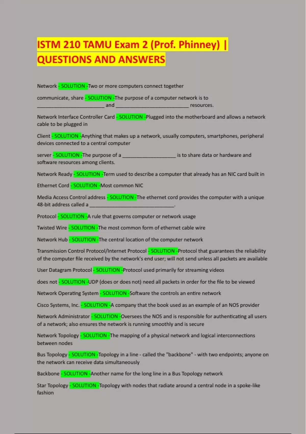 ISTM 210 TAMU Exam 2 (Prof. Phinney) | QUESTIONS AND ANSWERS Network - SOLUTION -Two or more computers connect together communicate, share - SOLUTION -The purpose of a computer network is to ________________________ and __________________________ resources. Network Interface Controller Card - SOLUTION -Plugged into the motherboard and allows a network cable to be plugged in Client - SOLUTION -Anything that makes up a network, usually computers, smartphones, peripheral devices connected to a central computer server - SOLUTION -The purpose of a ___________________ is to share data or hardware and software resources among clients. Network Ready - SOLUTION -Term used to describe a computer that already has an NIC card built in Ethernet Cord - SOLUTION -Most common NIC Media Access Control address - SOLUTION -The ethernet cord provides the computer with a unique