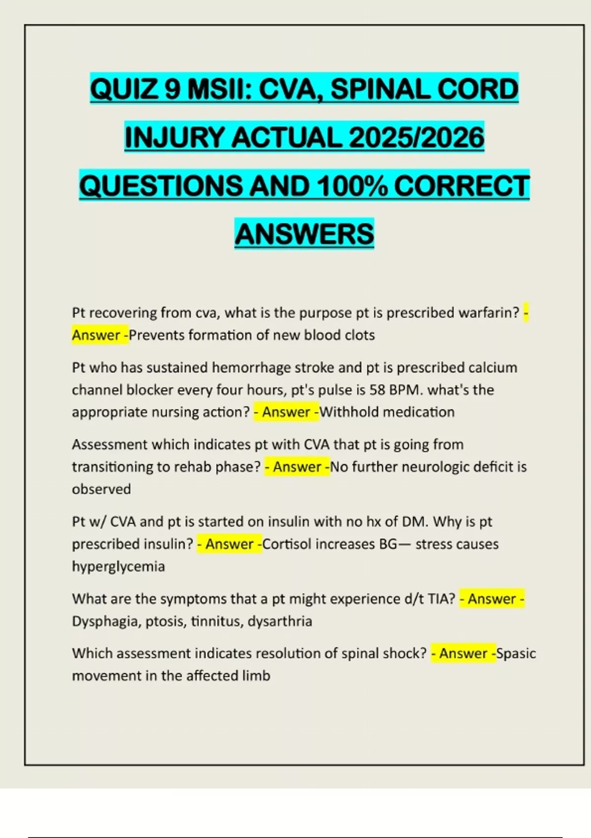 QUIZ 9 MSII: CVA, SPINAL CORD INJURY ACTUAL 2025/2026 QUESTIONS AND 100% CORRECT ANSWERS Pt recovering from cva, what is the purpose pt is prescribed warfarin? - Answer -Prevents formation of new blood clots Pt who has sustained hemorrhage stroke and pt is prescribed calcium channel blocker every four hours, pt's pulse is 58 BPM. what's the appropriate nursing action? - Answer -Withhold medication Assessment which indicates pt with CVA that pt is going from transitioning to rehab phase? - Answer -No further neurologic deficit is observed Pt w/ CVA and pt is started on insulin with no hx of DM. Why is pt prescribed insulin? - Answer -Cortisol increases BG— stress causes hyperglycemia What are the symptoms that a pt might experience d/t TIA? - Answer - Dysphagia, ptosis, tinnitus, dysarthria Which assessment indicates resolution of spinal shock? - Answer -Spasic movement in the affected limbTechnique the nurse should use to move the impaired legs of the pt .. to avoid muscle spasms? - Answer -Manipulate the limb by supporting the knee and joints Technique for opening airway for a newly admitted pt with spinal cord injury? - Answer -jaw thrust Brown sequard syndrome- which neurologic deficit can result in this? - Answer -ipsilateral loss of motor function and contralateral loss of pain and temperature Which level of independence