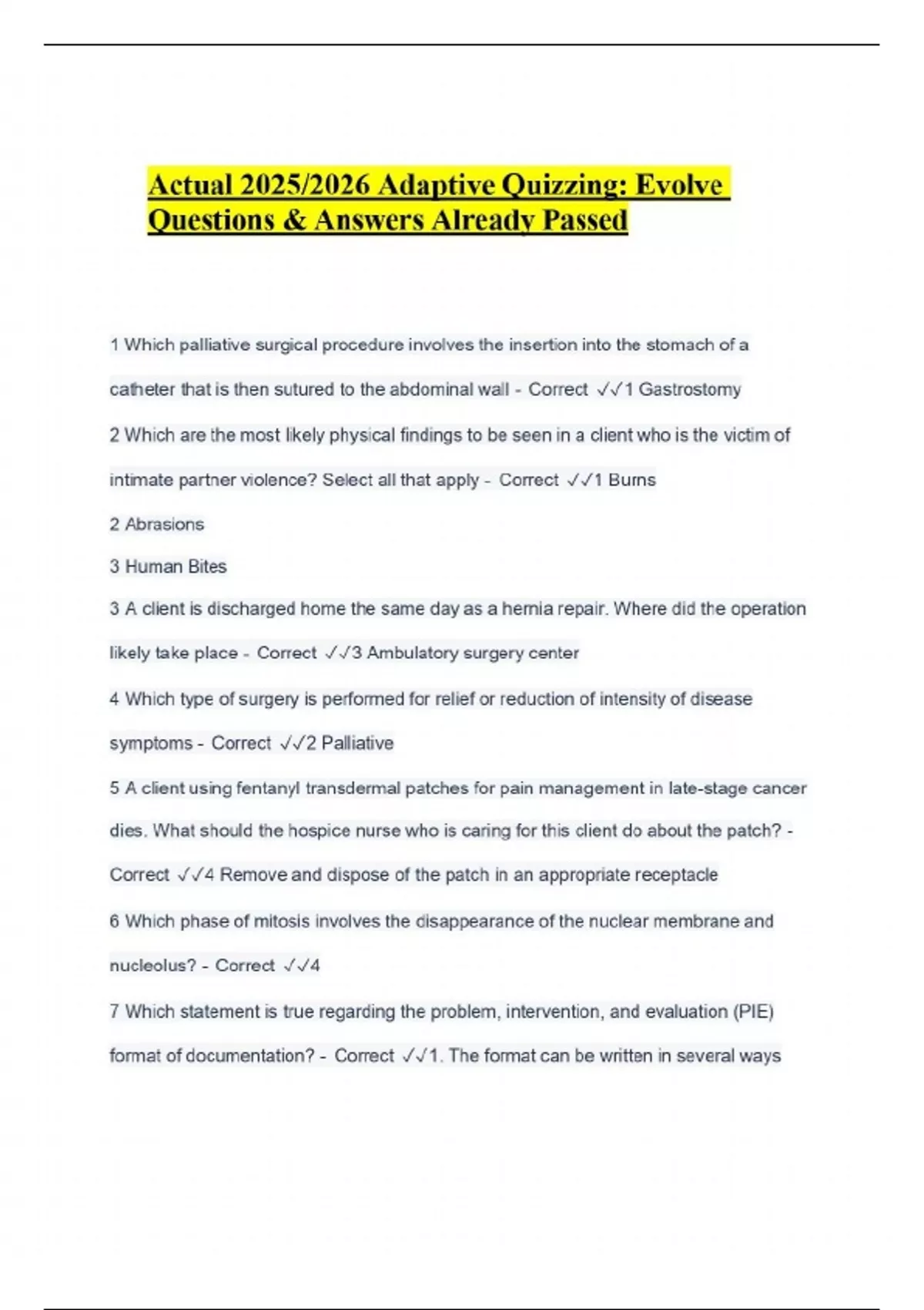 Actual 2025/2026 Adaptive Quizzing: Evolve Questions & Answers Already Passed