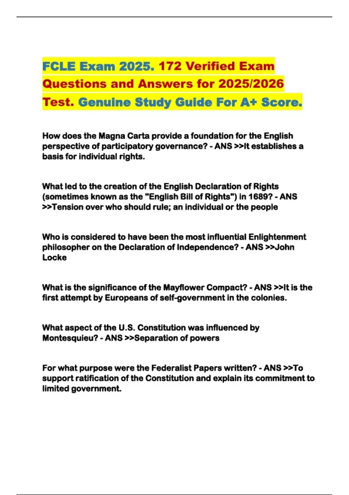 FCLE Exam 2025. 172 Verified Exam Questions and Answers for 2025/2026 Test. Genuine Study Guide For A+ Score. How does the Magna Carta provide a foundation for the English perspective of participatory governance? - ANS It establishes a basis for individual rights. What led to the creation of the English Declaration of Rights (sometimes known as the "English Bill of Rights") in 1689? - ANS Tension over who should rule; an individual or the people Who is considered to have been the most influential Enlightenment philosopher on the Declaration of Independence? - ANS John Locke What is the significance of the Mayflower Compact? - ANS It is the first attempt by Europeans of self-government in the colonies. What aspect of the U.S. Constitution was influenced by Montesquieu? - ANS Separation of powers For what purpose were the Federalist Papers written? - ANS To support ratification of the Constitution and explain its commitment to limited government. What did the anti-Federalist want the Constitution to include? - ANS A bill of rights What rights are listed in the Declaration of Independence? - ANS Life, liberty, and pursuit of happiness For what purpose did Thomas Paine write Common Sense? - ANS To encourage the colonists to demand independence from Great Britain Which of the following were thought to be weaknesses of the government laid out by the Articles of Confederation? - ANS no power to tax and no executive or judiciary A state that permits citizens to vote directly on laws and policies is practicing a form of: - ANS direct democracy An individual's belief that ordinary citizens can affect what government does is: - ANS political efficacy The principle that authority of the government rests in the hands of the people is: - ANS popular sovereignty The "rule of law" is best described as: - ANS citizens are governed by laws; no one is above the law In the U.S., voters chose representatives from the state to represent them in the U.S. Congress. This is known as: - ANS indirect democracy Which of the following are reserved for U.S. citizens only? - ANS voting, serving on a jury, and holding federal office Which of the following best are the two dominant political parties in the U.S. - ANS Democrats and Republicans In general, the Republican party is ideologically - ANS conservative Who is responsible for registering voters in the state of Florida? - ANS a county supervisor of elections Who is the chief executive in a state? - ANS the governor Congress creates laws, but those laws can be vetoed by the president or overturned by the Supreme Court. This is an example of a Constitutional principle known as: - ANS Checks and Balances Articles one, two, and three in the Constitution reflect which constitutional principle: - ANS separation of powers Which part of the U.S. Constitution declares it to be the supreme law of the land? - ANS Article VI The concept of self-government can be found in: - ANS the preamble beginning with "we the people" How many amendments have been added to the Constitution? - ANS 27 Which of the following best describes the concept of 'rule of law': - ANS No one is above the law, including government and elected officials. Which of the following best describes federalism: - ANS a dual system of sovereignty where both national and state governments have authority. What is the purpose of the 22nd amendment: - ANS Limits the president to two terms