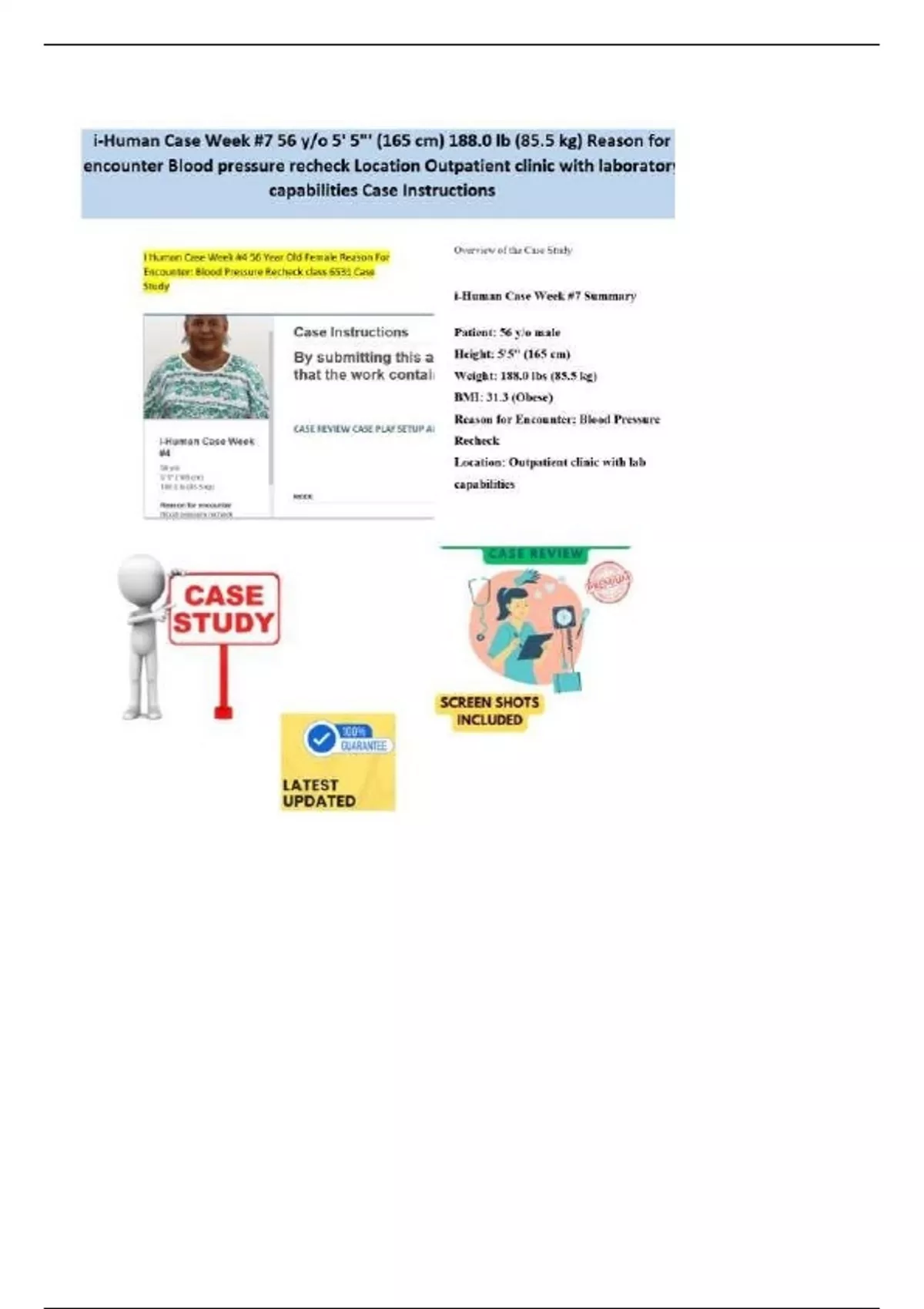 I-HUMAN CASE WEEK #7 56 Y/O FEMALE HEIGHT: 5’5” (165 CM)WEIGHT: 188.0 LB (85.5 KG)REASON FOR ENCOUNTER: BLOOD PRESSURE RECHECK LOCATION: OUTPATIENT CLINIC WITH LABORATORY CAPABILITIES(CLASS 6512)LATEST 2025!