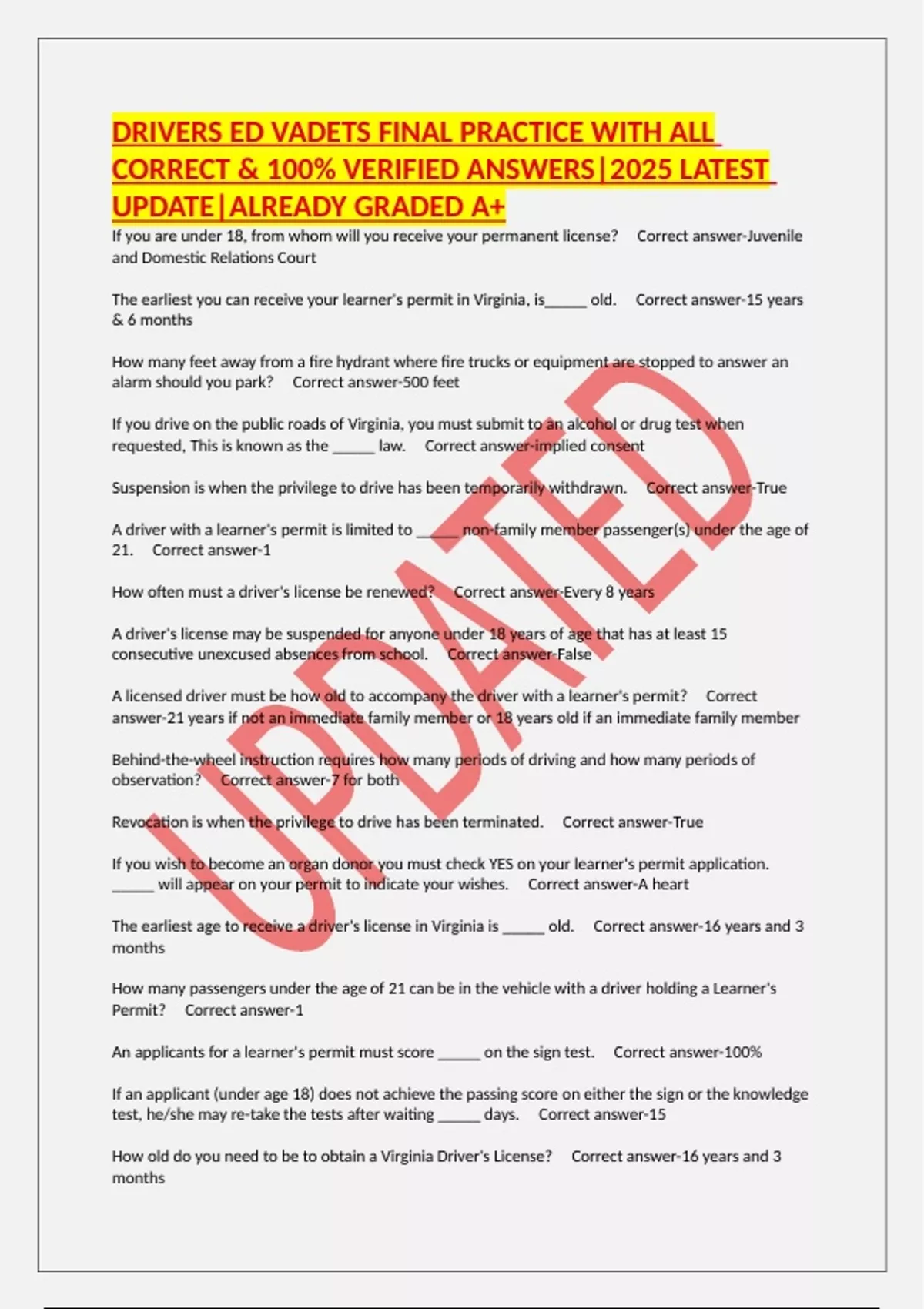 DRIVERS ED VADETS FINAL PRACTICE WITH ALL CORRECT & 100% VERIFIED ANSWERS|2025 LATEST UPDATE|ALREADY GRADED A+