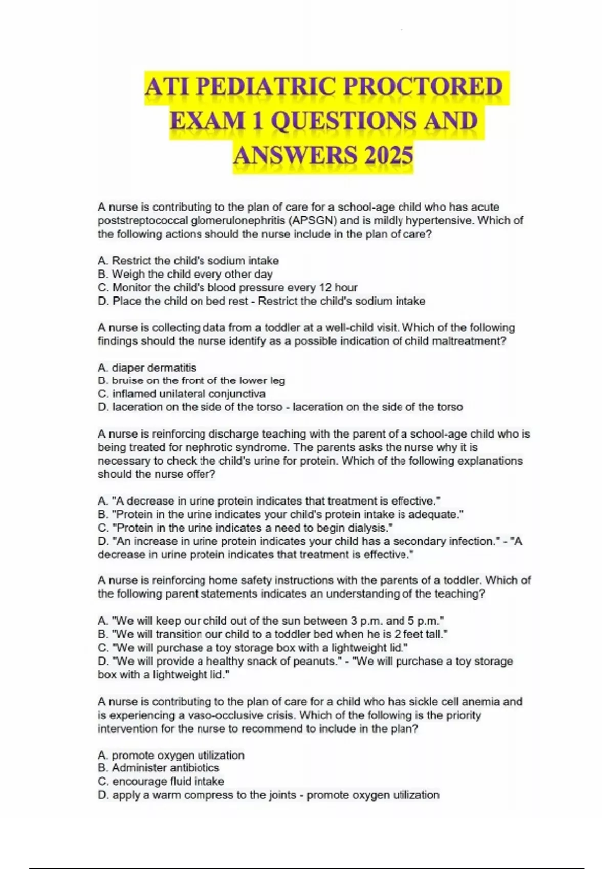 This document provides the full set of questions and correct answers for ATI Pediatrics Proctored Exam 1, updated for the 2025 exam cycle. It covers fundamental pediatric nursing topics such as developmental milestones, pediatric medication administration, common childhood illnesses, immunization schedules, family-centered care, safety and injury prevention, and communication with children and families. Ideal for nursing students preparing for ATI's first pediatric proctored assessment