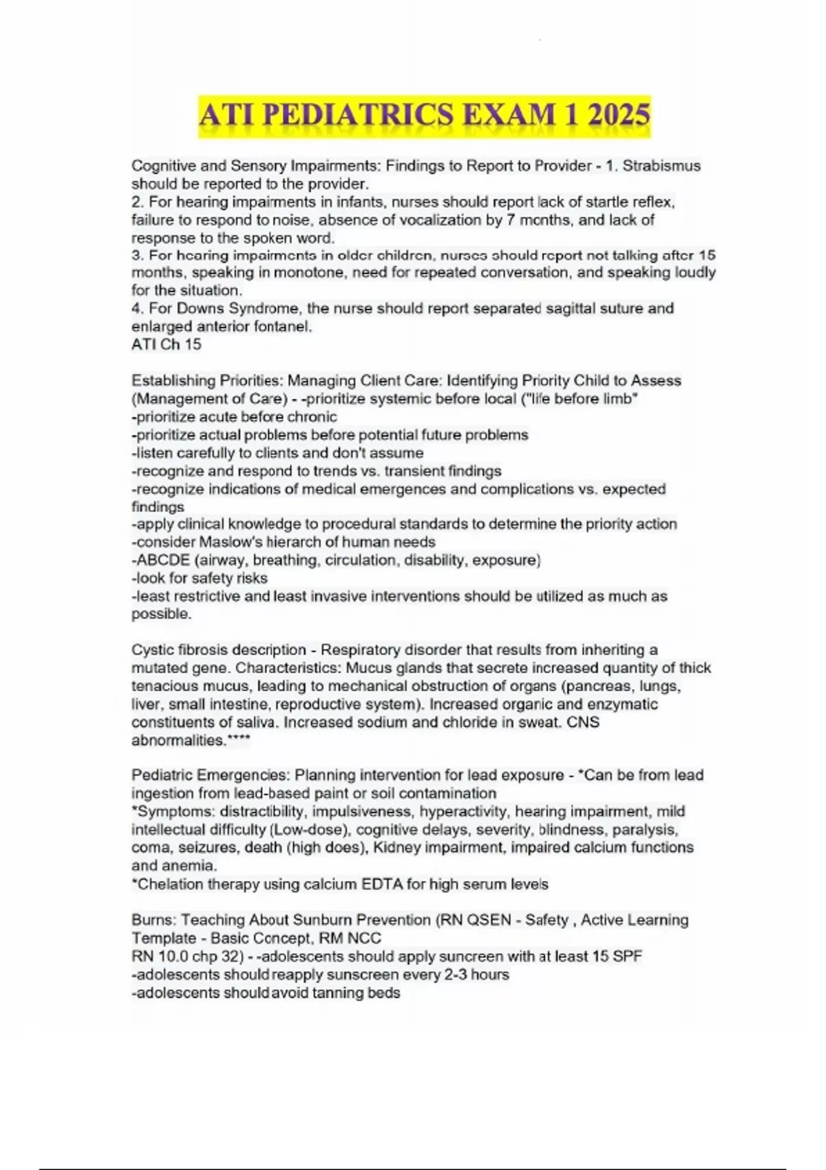 This document provides the complete set of updated questions and correct answers for ATI Pediatrics Exam 1, aligned with the 2025 exam content. It covers core pediatric nursing topics including growth and developmental stages, immunization schedules, pediatric disease management, medication administration for children, safety and prevention, and family-centered care. Perfect for nursing students preparing for ATI pediatric assessments or clinical evaluations.