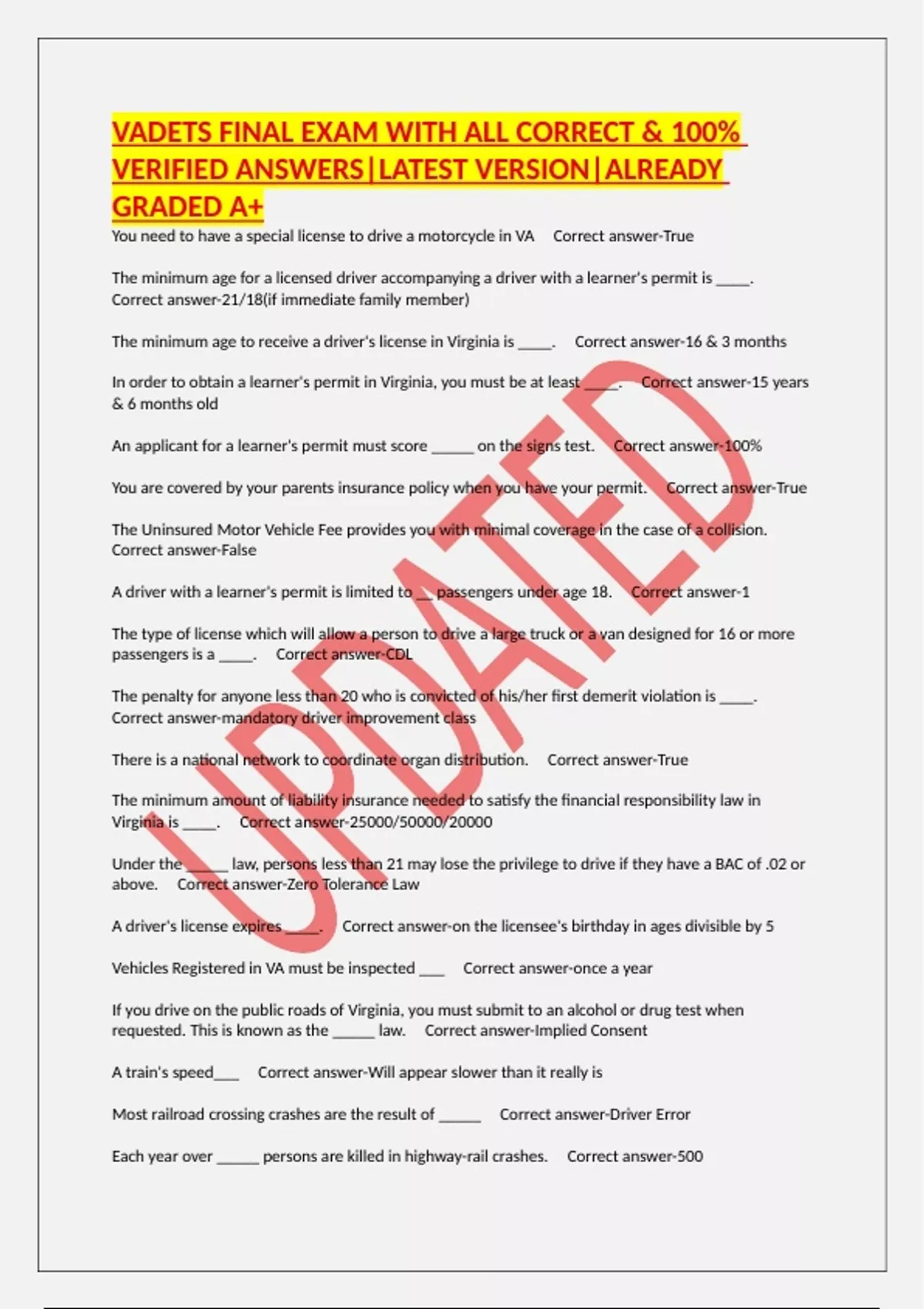 VADETS FINAL EXAM WITH ALL CORRECT & 100% VERIFIED ANSWERS|LATEST VERSION|ALREADY GRADED A+