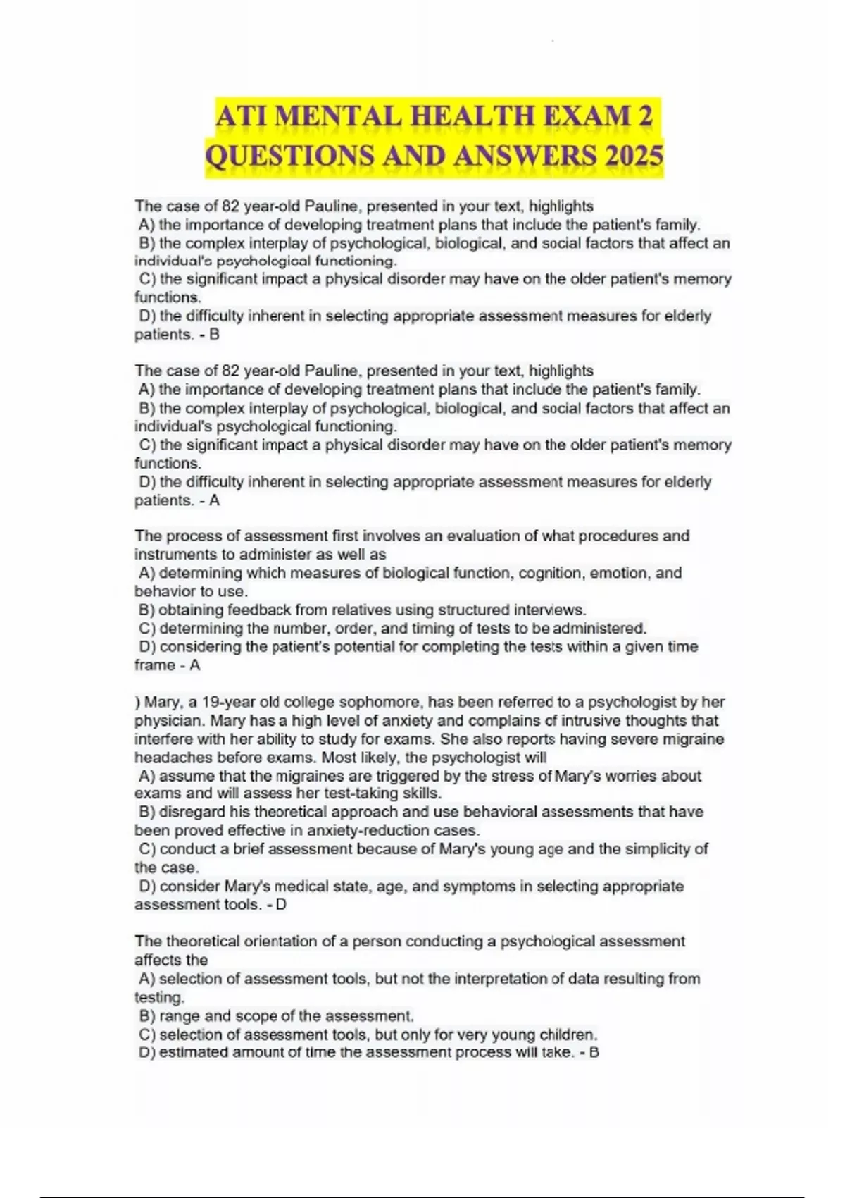 This document contains the complete set of updated questions and correct answers for ATI Mental Health Exam 2, designed for the 2025 testing cycle. It covers essential psychiatric nursing topics including therapeutic communication, defense mechanisms, crisis intervention, medication management (e.g., SSRIs, antipsychotics, mood stabilizers), mental health disorders, legal and ethical considerations, and safety protocols. Perfect for nursing students preparing for ATI's proctored mental health assessments.
