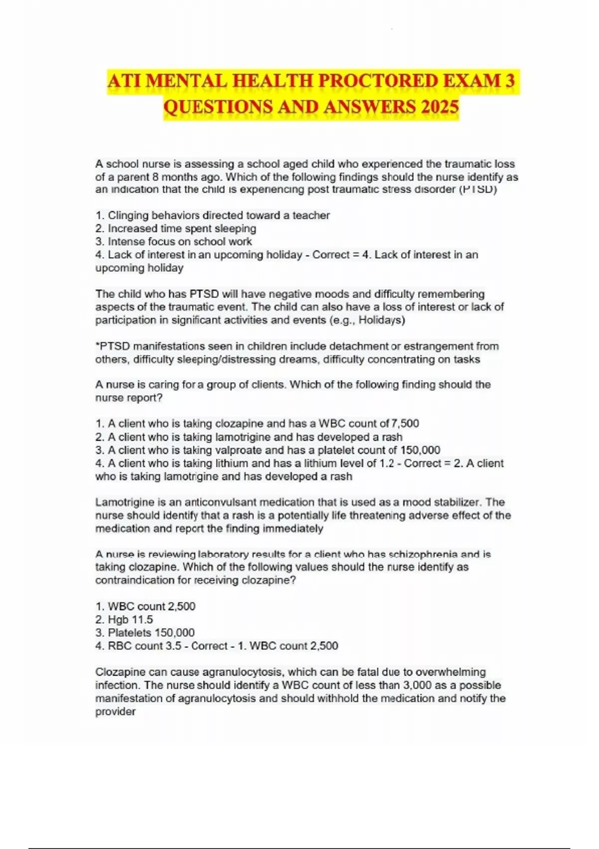 This document includes the full set of updated questions and correct answers for ATI Mental Health Proctored Exam 3, designed for the 2025 testing cycle. It covers high-yield psychiatric nursing topics such as therapeutic communication, mental health disorders (e.g., schizophrenia, bipolar disorder, PTSD), psychotropic medication management, patient safety, legal/ethical responsibilities, and crisis and de-escalation strategies. Ideal for nursing students preparing for ATI’s advanced mental health assessments.