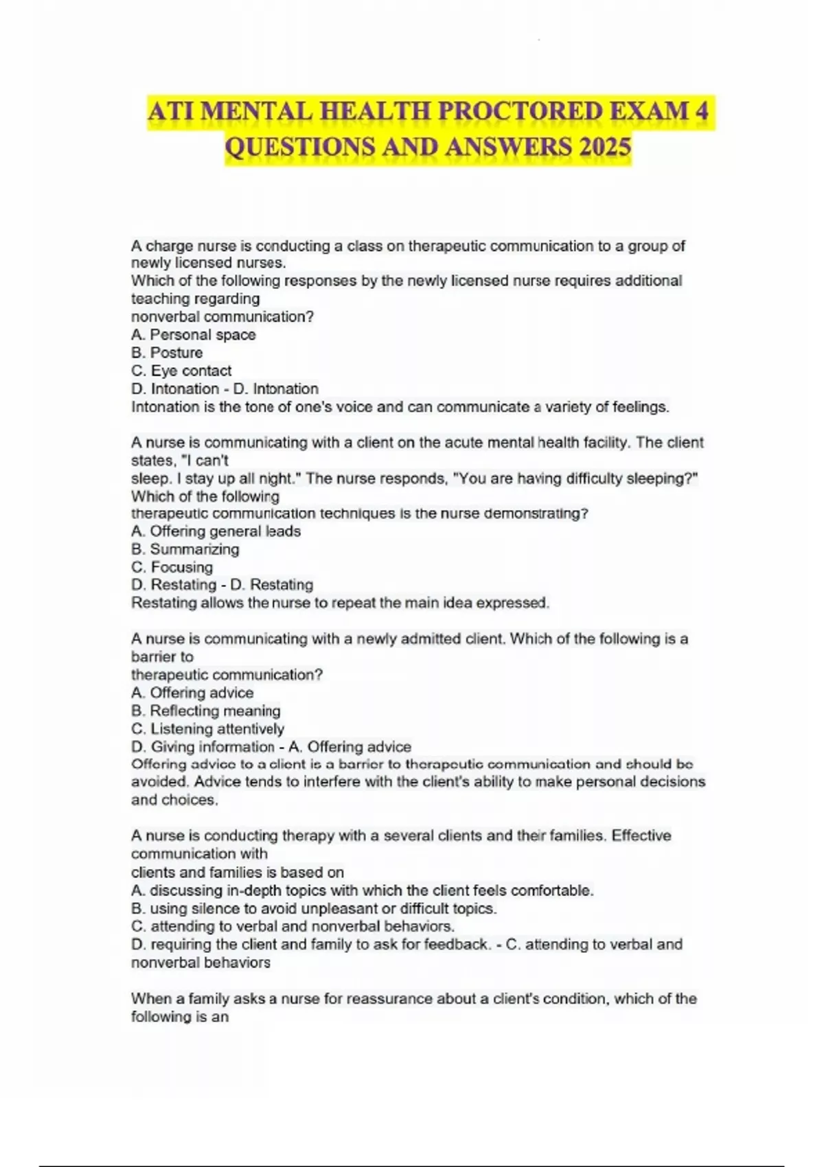This document provides the complete set of questions and accurate answers for the ATI Mental Health Proctored Exam 4, fully updated for the 2025 exam cycle. It covers essential mental health nursing content, including therapeutic communication, psychiatric disorders (such as depression, anxiety, and personality disorders), medication administration, safety protocols, legal/ethical responsibilities, and crisis management. Ideal for nursing students preparing for advanced ATI mental health assessments.
