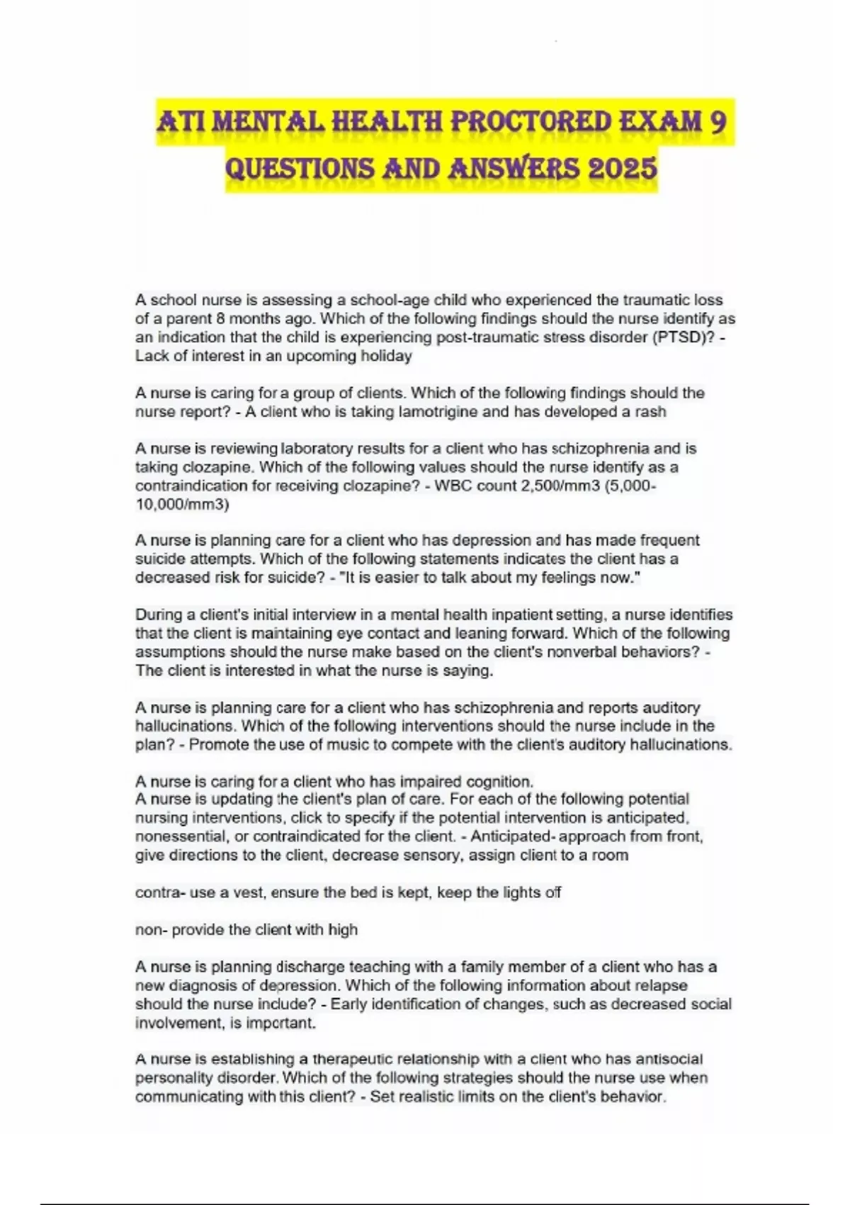 This document provides the complete set of questions and correct answers for ATI Mental Health Proctored Exam 9, updated for the 2025 testing cycle. It covers all critical areas of psychiatric nursing, including therapeutic communication, psychotropic medications, crisis management, legal and ethical considerations, suicide and safety precautions, and management of disorders such as depression, schizophrenia, bipolar disorder, and PTSD. Ideal for students preparing for the ATI mental health proctored assessments.