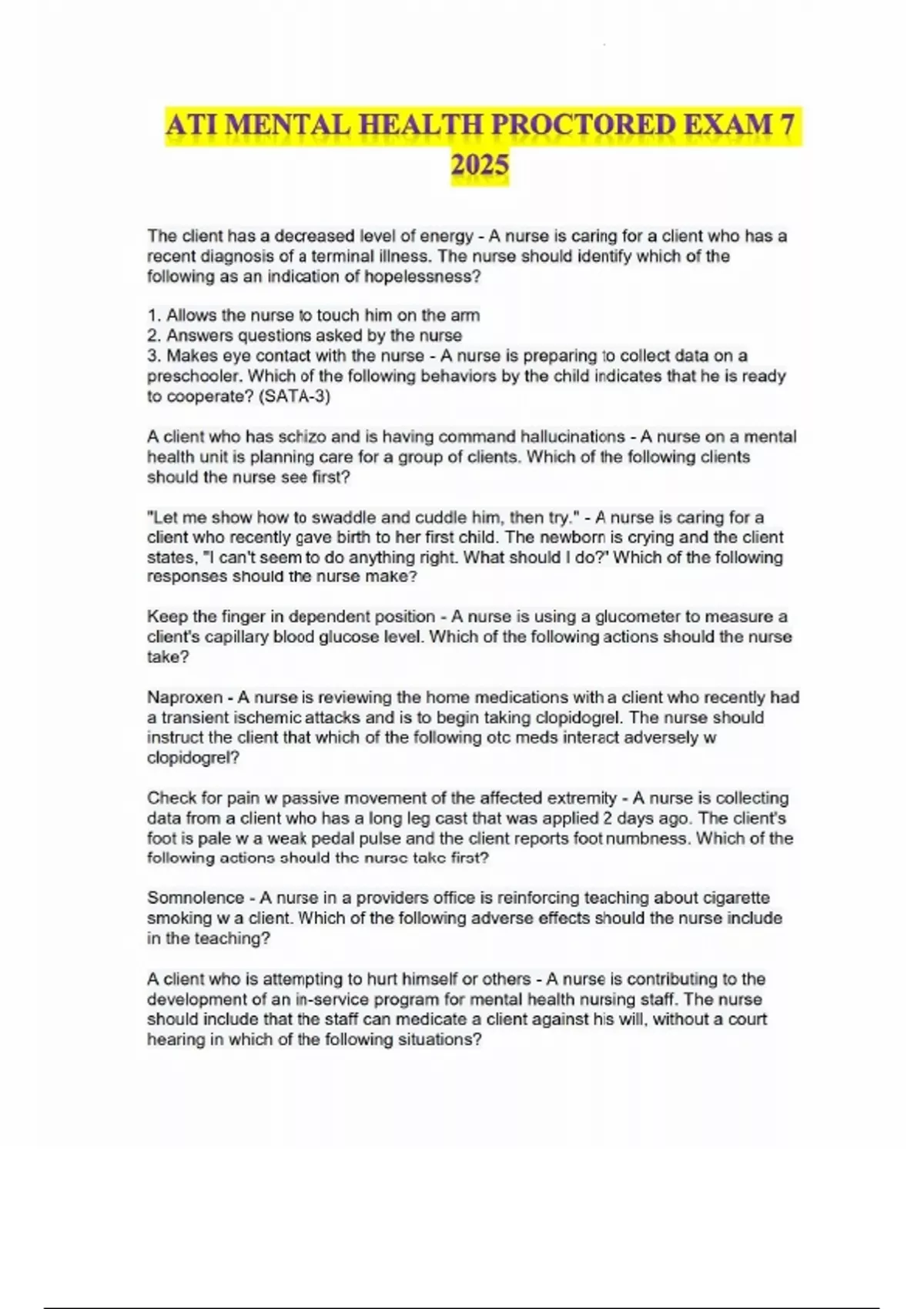 This document contains the complete set of updated questions and correct answers for ATI Mental Health Proctored Exam 7, aligned with the 2025 exam cycle. It covers essential psychiatric nursing topics such as therapeutic communication, psychotropic medications, suicide and safety precautions, legal and ethical responsibilities, mental health disorders (e.g., schizophrenia, anxiety, depression, bipolar disorder), and crisis intervention strategies. This resource is ideal for nursing students preparing for ATI's advanced mental health proctored assessments.