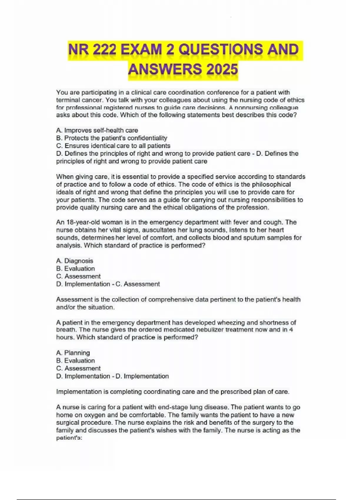 This document contains the full set of updated questions and correct answers for NR 222 Exam 2, tailored to the 2025 curriculum. It covers core nursing concepts related to health promotion and wellness, including patient education, health belief models, levels of prevention, cultural competence, developmental theories (e.g., Erikson, Piaget), and motivational interviewing. This study resource is ideal for Chamberlain nursing students preparing for Exam 2 in the NR 222 course.