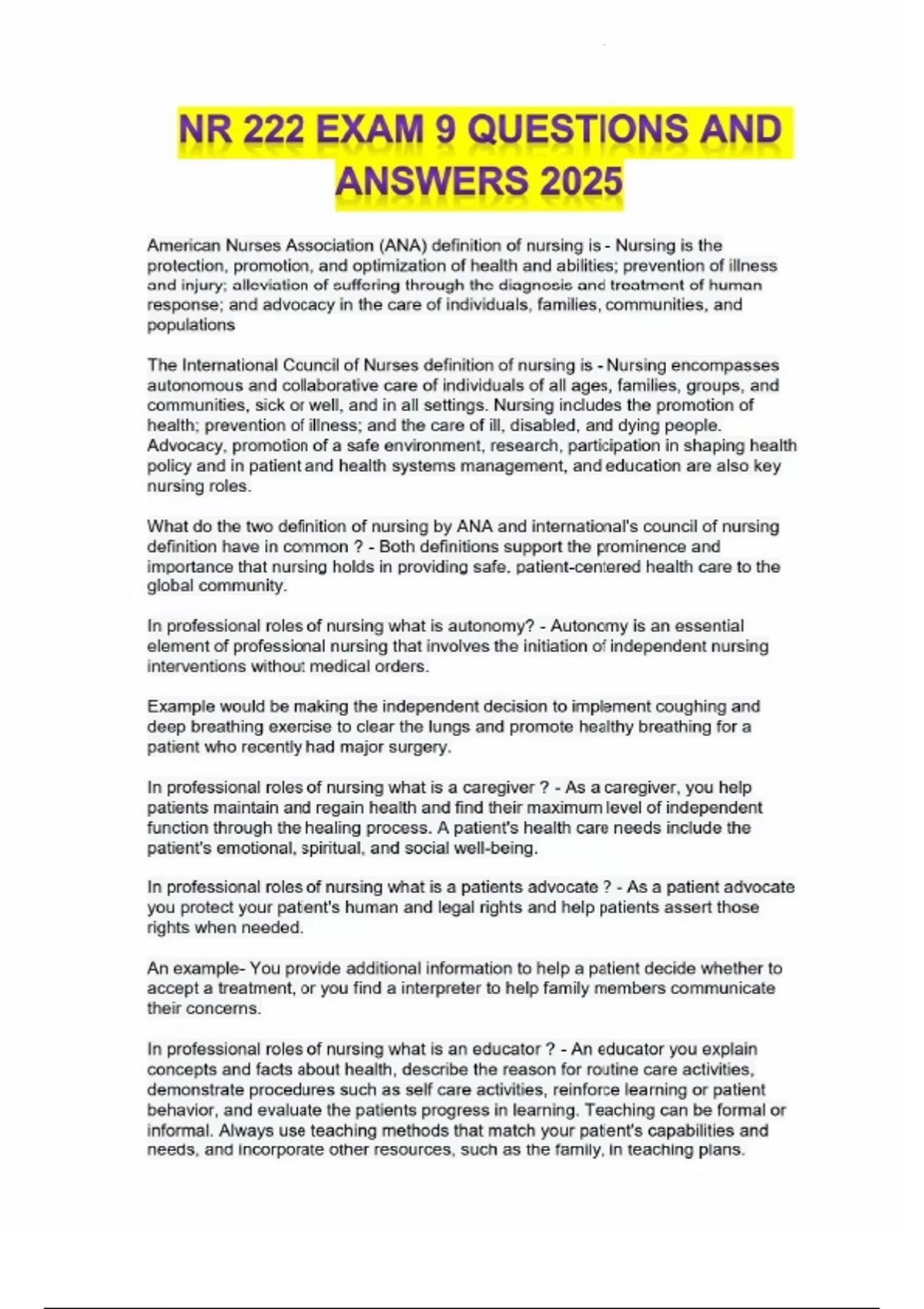 This document includes the full set of verified questions and correct answers for NR 222 Exam 9, updated for the 2025 academic year. It covers key nursing concepts related to health promotion across the lifespan, including wellness education, health screening guidelines, cultural competence, behavioral change models, family dynamics, and patient-centered care. This resource is perfect for Chamberlain nursing students preparing for advanced-level assessments in the NR 222 course