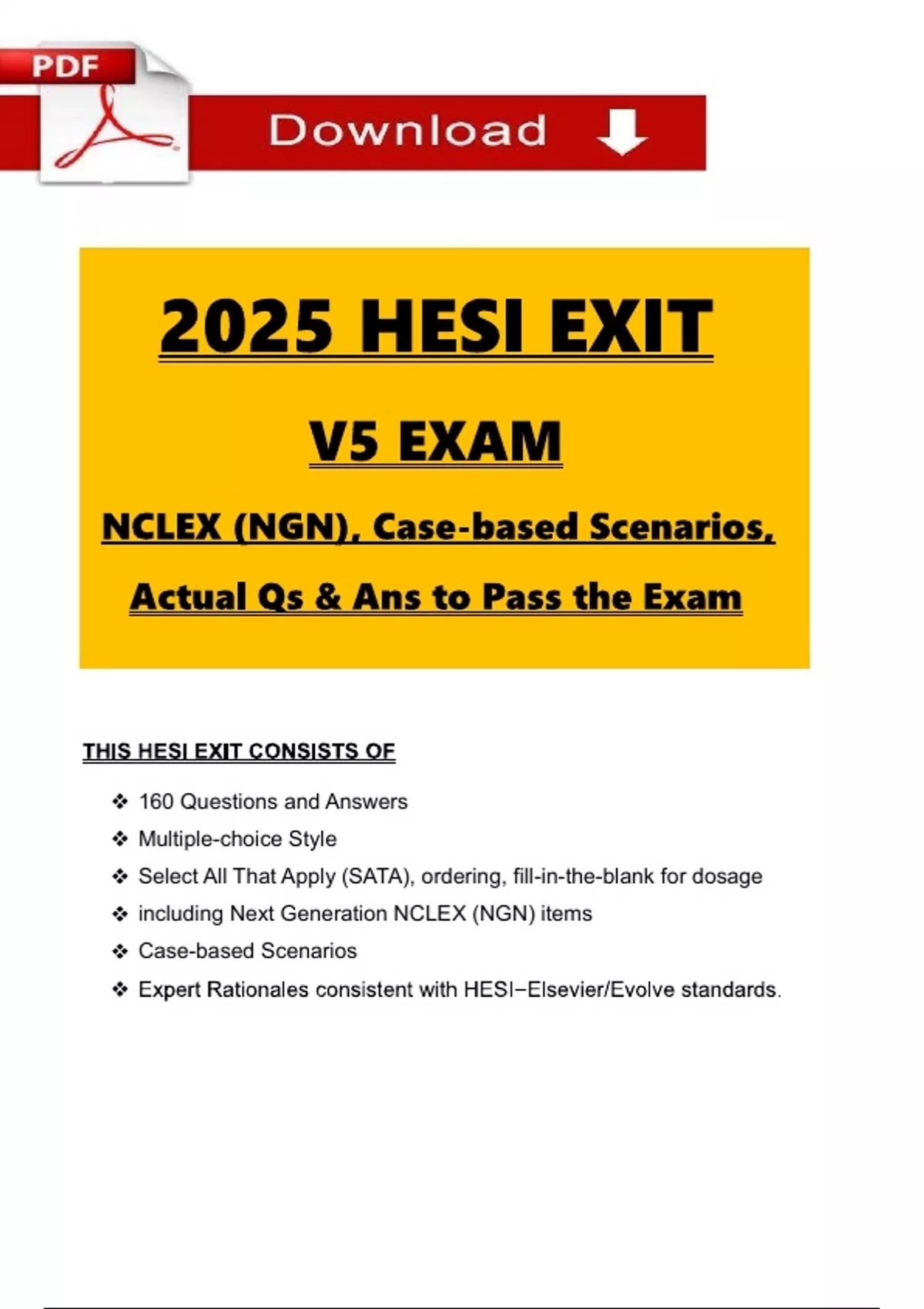 ****** INSTANT DOWNLOAD PDF FILE ****** 2025 RN HESI Exit V5 Exam Actual Qs & Ans to Pass the Exam (NGN style Qs & Case studies), 100% Verified, 2025 RN HESI Exit Exam, 2025 RN HESI Exit Exam, HESI NGN style questions, HESI case studies 2025, HESI Exit Exam actual questions, RN HESI Exit Exam practice, HESI Exit Exam strategies, 2024 RN HESI study guide, HESI Exit Exam review materials, HESI Next Generation NCLEX alignment, Passing RN HESI 2025, Comprehensive HESI Q&A, Nursing school HESI preparation, RN HESI Exit Exam tips, HESI NGN case studies, 2025 RN HESI question bank, Best resources for HESI Exit Exam, HESI Exit Exam passing score, HESI Exit Exam practice test 2025, NGN clinical judgment for HESI, RN HESI Exit Exam blueprint, 2024 nursing HESI exit prep, Improve HESI Exam results, HESI Exit Exam question types, Critical thinking for HESI NGN, HESI Exit Exam content review, Study plan for HESI 2025, HESI Exit Exam confidence tips, HESI remediation techniques, RN HESI Exit Exam success.