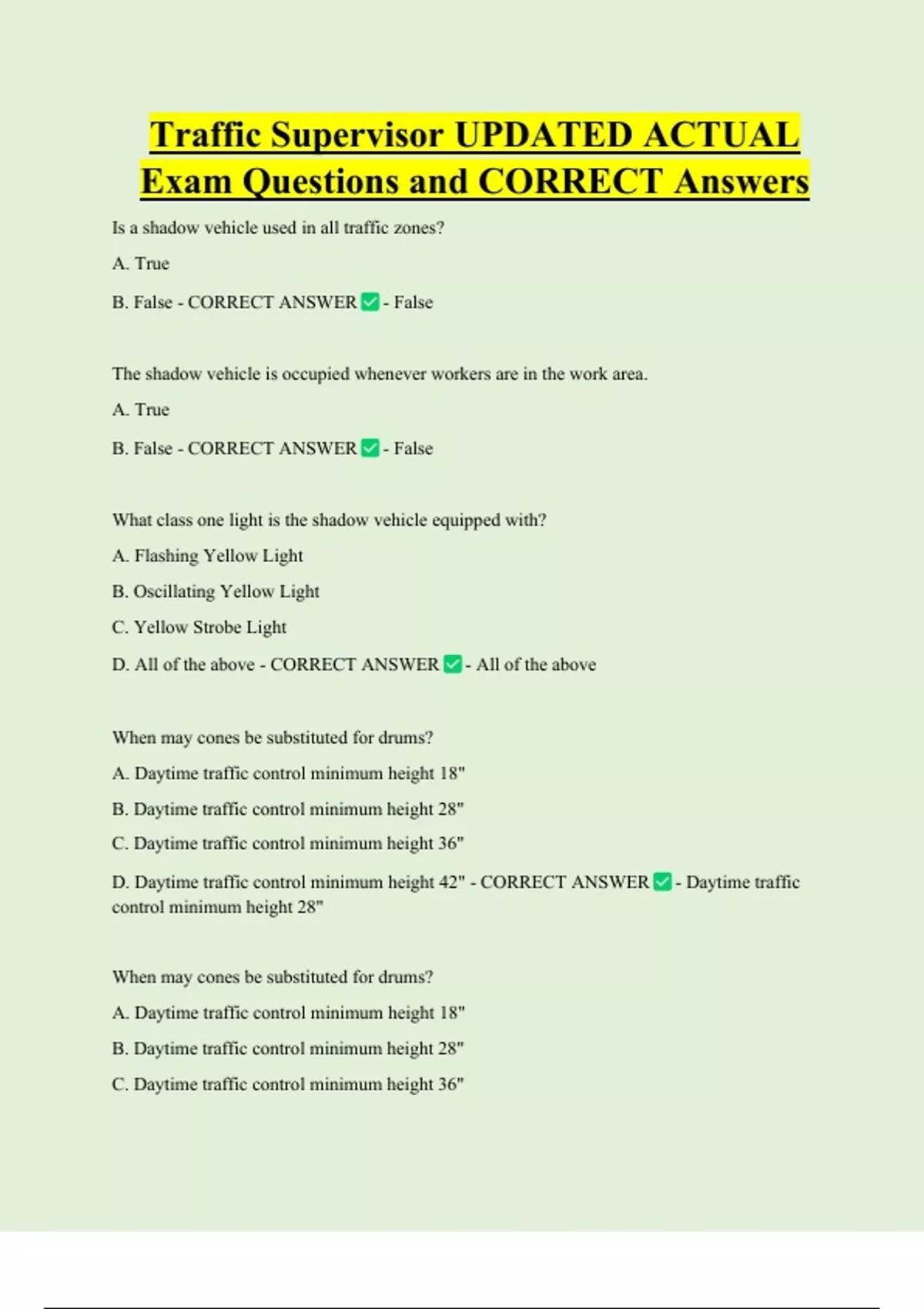 Traffic Supervisor UPDATED ACTUAL Exam Questions and CORRECT Answers Is a shadow vehicle used in all traffic zones? A. True B. False - CORRECT ANSWER - False The shadow vehicle is occupied whenever workers are in the work area. A. True B. False - CORRECT ANSWER - False What class one light is the shadow vehicle equipped with