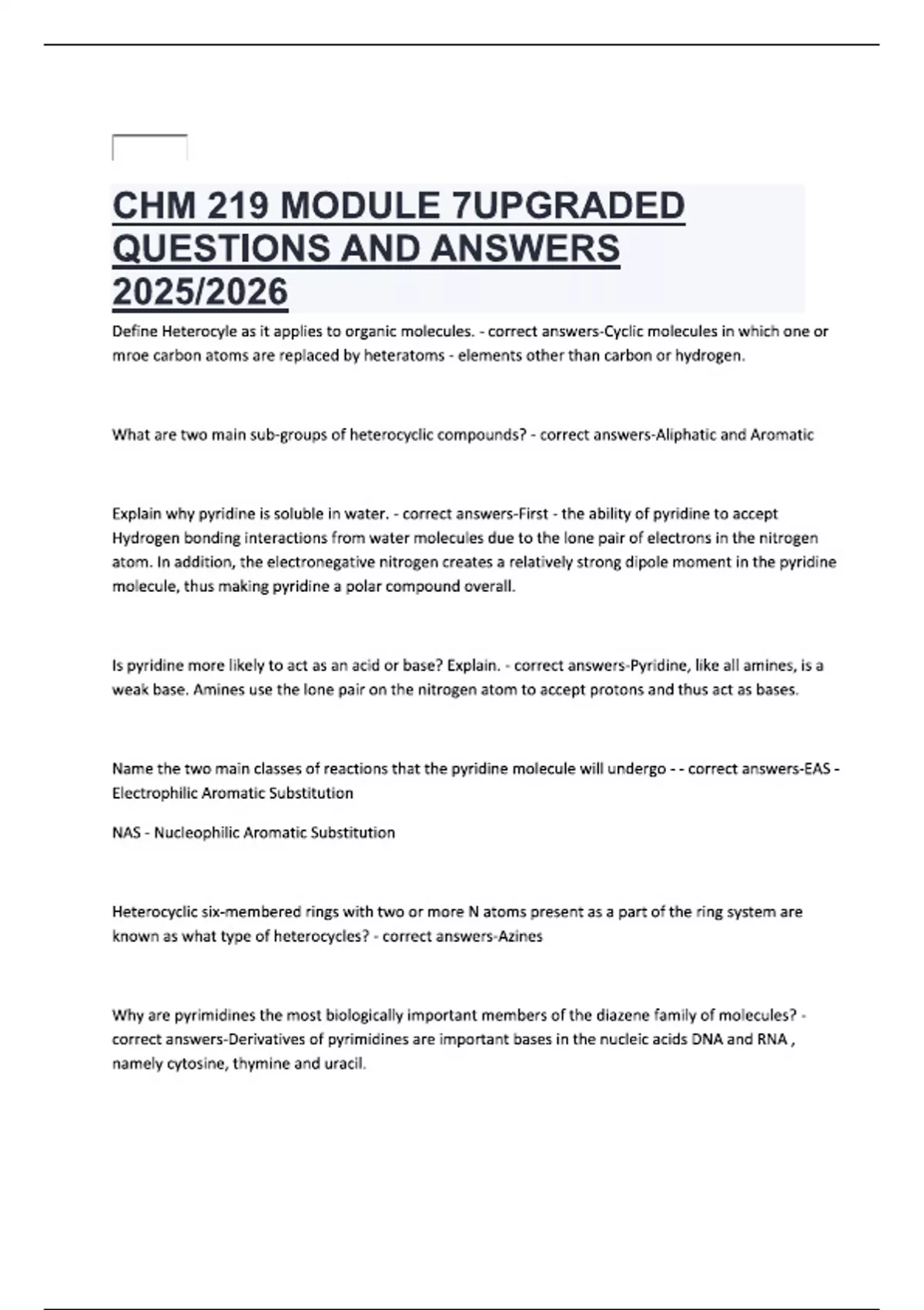 CHM 219 MODULE 7UPGRADED QUESTIONS AND ANSWERS 2025/2026 Define Heterocyle as it applies to organic molecules. - correct answers-Cyclic molecules in which one or mroe carbon atoms are replaced by heteratoms - elements other than carbon or hydrogen. What are two main sub-groups of heterocyclic compounds? - correct answers-Aliphatic and Aromatic Explain why pyridine is soluble in water. - correct answers-First - the ability of pyridine to accept Hydrogen bonding interactions from water molecules due to the lone pair of electrons in the nitrogen atom. In addition, the electronegative nitrogen creates a relatively strong dipole moment in the pyridine molecule, thus making pyridine a polar compound overall. Is pyridine more likely to act as an acid or base? Explain. - correct answers-Pyridine, like all amines, is a weak base. Amines use the lone pair on the nitrogen atom to accept protons and thus act as bases. Name the two main classes of reactions that the pyridine molecule will undergo - - correct answers-EAS - Electrophilic Aromatic Substitution NAS - Nucleophilic Aromatic Substitution Heterocyclic six-membered rings with two or more N atoms present as a part of the ring system are known as what type of heterocycles? - correct answers-Azines Why are pyrimidines the most biologically important members of the diazene family of molecules? - correct answers-Derivatives of pyrimidines are important bases in the nucleic acids DNA and RNA , namely cytosine, thymine and uracil.