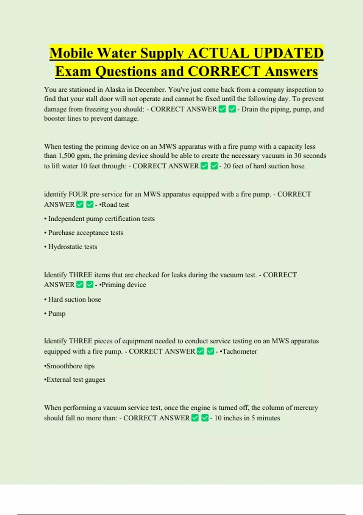 Mobile Water Supply ACTUAL UPDATED Exam Questions and CORRECT Answers You are stationed in Alaska in December. You've just come back from a company inspection to find that your stall door will not operate and cannot be fixed until the following day. To prevent damage from freezing you should: - CORRECT ANSWER - Drain the piping, pump, and booster lines to prevent damage. When testing the priming device on an MWS apparatus with a fire pump with a capacity less than 1,500 gpm, the priming device should be able to create the necessary vacuum in 30 seconds to lift water 10 feet through: - CORRECT ANSWER - 20 feet of hard suction hose