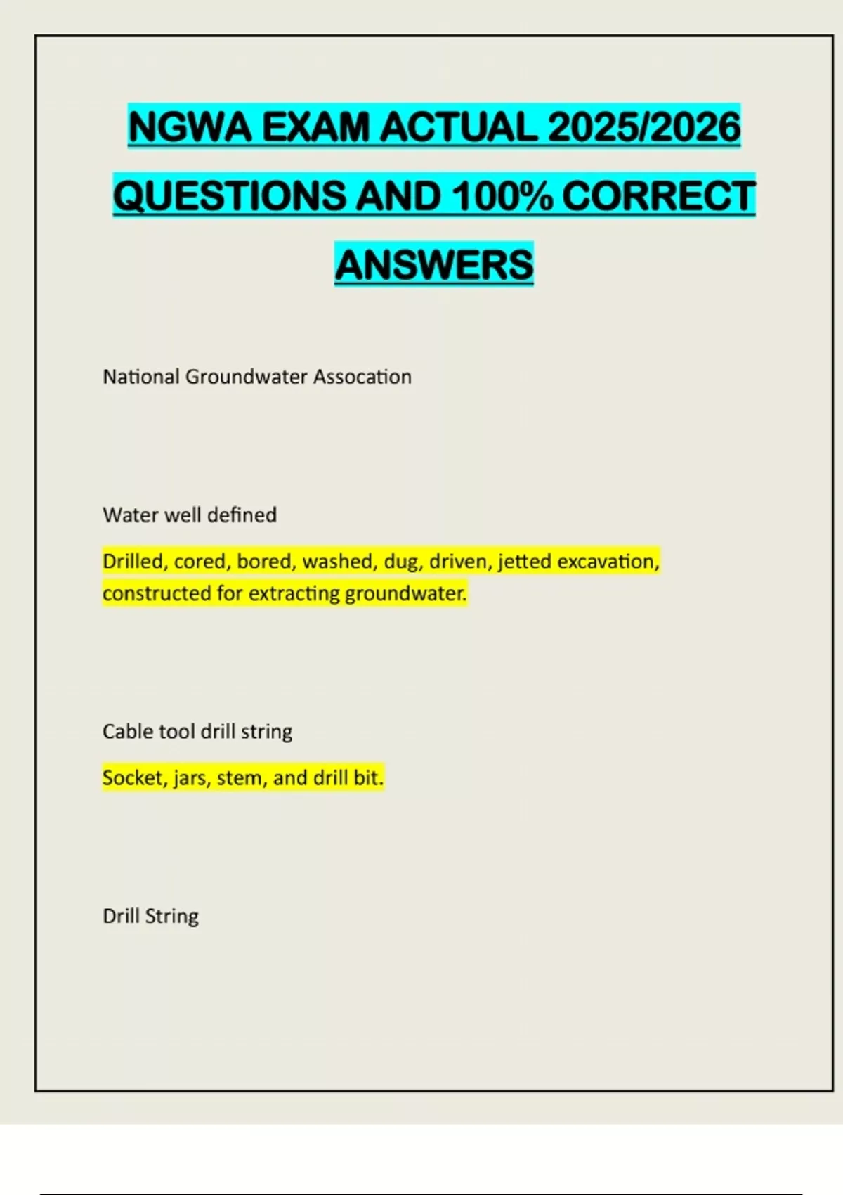 NGWA EXAM ACTUAL 2025/2026 QUESTIONS AND 100% CORRECT ANSWERS National Groundwater Assocation Water well defined Drilled, cored, bored, washed, dug, driven, jetted excavation, constructed for extracting groundwater. Cable tool drill string Socket, jars, stem, and drill bit. Drill StringEntire column of string or drill pipe,drill collars, and accessories that transmit fluid and/or rotational power from Kelly(top head drive) to the drill collars and bit. Rotary Drill string Drill bit, Drill collar (stabilizer), Drill pipe, Kelly (top head) Porosity The percentage of void spaces or holes in geologic formation. The amount of connected pore spaces Barite barium sulfate (BaSO4), a mineral used to increase the weight of drilling fluid (mud); its specific gravity is 4.2 Air Rotary Drilling