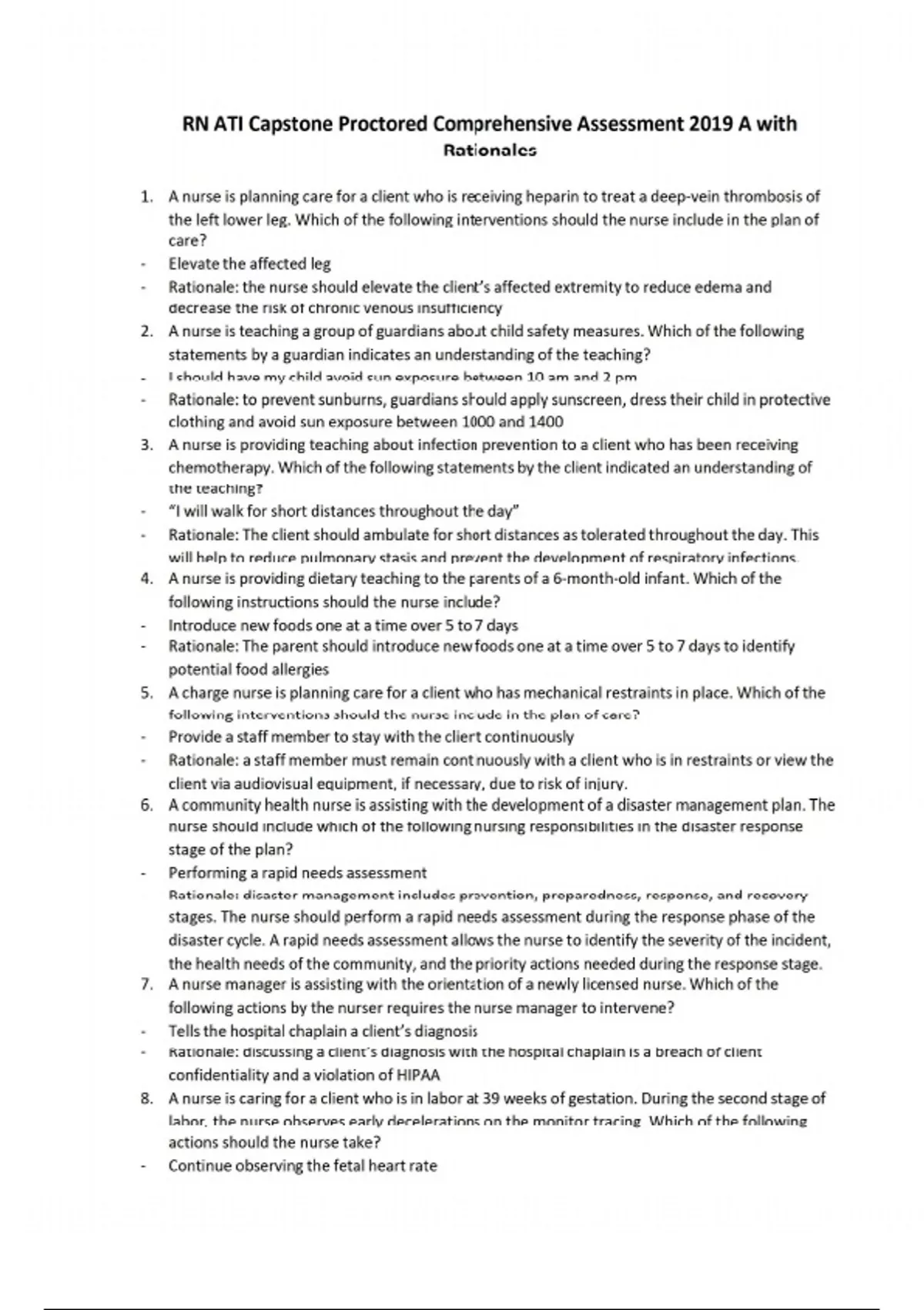 1. A nurse is planning care for a client who is receiving heparin to treat a deep-vein thrombosis of the left lower leg. Which of the following interventions should the nurse include in the plan of care? - Elevate the affected leg - Rationale: the nurse should elevate the client’s affected extremity to reduce edema and decrease the risk of chronic venous insufficiency 2. A nurse is teaching a group of guardians about child safety measures. Which of the following statements by a guardian indicates an understanding of the teaching? - I should have my child avoid sun exposure between 10 am and 2 pm - Rationale: to prevent sunburns, guardians should apply sunscreen, dress their child in protective clothing and avoid sun exposure between 1000 and 1400 3. A nurse is providing teaching about infection prevention to a client who has been receiving chemotherapy. Which of the following statements by the client indicated an understanding of the teaching? - “I will walk for short distances throughout the day” - Rationale: The client should ambulate for short distances as tolerated throughout the day. This will help to reduce pulmonary stasis and prevent the development of respiratory infections. 4. A nurse is providing dietary teaching to the parents of a 6-month-old infant. Which of the following instructions should the nurse include? - Introduce new foods one at a time over 5 to 7 days - Rationale: The parent should introduce new foods one at a time over 5 to 7 days to identify potential food allergies 5. A charge nurse is planning care for a client who has mechanical restraints in place. Which of the following interventions should the nurse include in the plan of care? - Provide a staff member to stay with the client continuously - Rationale: a staff member must remain continuously with a client who is in restraints or view the client via audiovisual equipment, if necessary, due to risk of injury. 6. A community health nurse is assisting with the development of a disaster management plan. The nurse should include which of the following nursing responsibilities in the disaster response stage of the plan? - Performing a rapid needs assessment - Rationale: disaster management includes prevention, preparedness, response, and recovery stages. The nurse should perform a rapid needs assessment during the response phase of the disaster cycle. A rapid needs assessment allows the nurse to identify the severity of the incident, the health needs of the community, and the priority actions needed during the response stage. 7. A nurse manager is assisting with the orientation of a newly licensed nurse. Which of the following actions by the nurser requires the nurse manager to intervene? - Tells the hospital chaplain a client’s diagnosis - Rationale: discussing a client’s diagnosis with the hospital chaplain is a breach of client confidentiality and a violation of HIPAA 8. A nurse is caring for a client who is in labor at 39 weeks of gestation. During the second stage of labor, the nurse observes early decelerations on the monitor tracing. Which of the following actions should the nurse take? - Continue observing the fetal heart rate - Rationale: early decelerations indicate the progression of labor and are an expected finding. The nurse should monitor the fetus by observing the fetal heart rate and tracing. 9. A nurse manager is planning to make changes to the current scheduling system on the unit. To facilitate the staff’s acceptance of this change, which of the following actions should the nurse manager take first? - Provide information about scheduling issues to the staff - Rationale: the first stage of the change process is the unfreezing stage, when the nurse should inform the staff about the current staffing issues. This can increase their understanding of why the changes are necessary. 10. A nurse is planning teaching about allowable foods for a client who has a history of uric acidbased urinary calculi formation. Which of the following foods should the nurse include in the teaching? - Oranges - Rationale: a client who is prone to uric acid calculi formation can eat citrus fruits 11. A charge nurse is teaching a newly licensed nurse how to identify true labor. Which of the following should the nurse include in the teaching? - The cervix transitions to an anterior position - Rationale: in true labor the cervix transitions to an anterior position and begins to filate in the preparation for birth. 12. A nurse on a medical-surgical unit is caring for a client prior to a surgical procedure. Which of the following findings should indicate to the nurse that the client has the ability to sign the informed consent? - The client is able to accurately describe the upcoming procedure - Rationale: the ability of the client to accurately describe the upcoming procedure indicates that the provider adequately informed the client, and that the client is able to sign the informed consent form 13. A charge nurse assigns a newly licensed nurse to care for a client who has a chest tube. The nurse expresses concern about having limited experience with monitoring chest tube drainage. Which of the following actions should the charge nurse take first to provide teaching about chest tubes? - Ask the nurse about their knowledge of the procedure - Rationale: the first action the charge nurse should take nursing the nursing process is to assess the newly licensed nurse’s knowledge about the procedure. By assessing the nurse’s knowledge the charge nurse can identify the nurse’s learning needs. 14. A nurse is teaching a client who has a new prescription for estradiol. For which of the following adverse effects of this medication should the nurse instruct the client to monitor and report to the provider? - Headaches - Rationale: the nurse should instruct the client to monitor for and report headaches. Headaches can be an indication of thromboembolic stroke because estradiol increases the risk for adverse cardiovascula