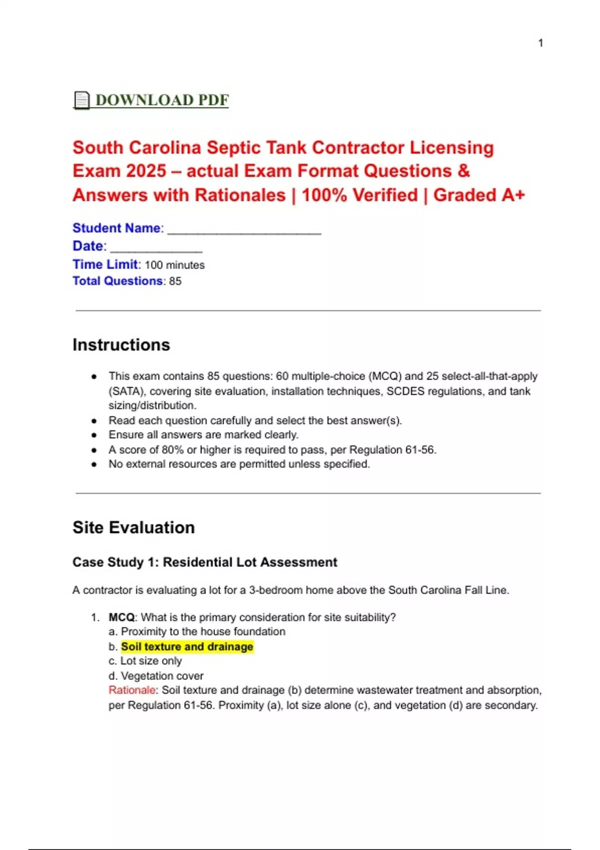 ● A score of 80% or higher is required to pass, per Regulation 61-56.