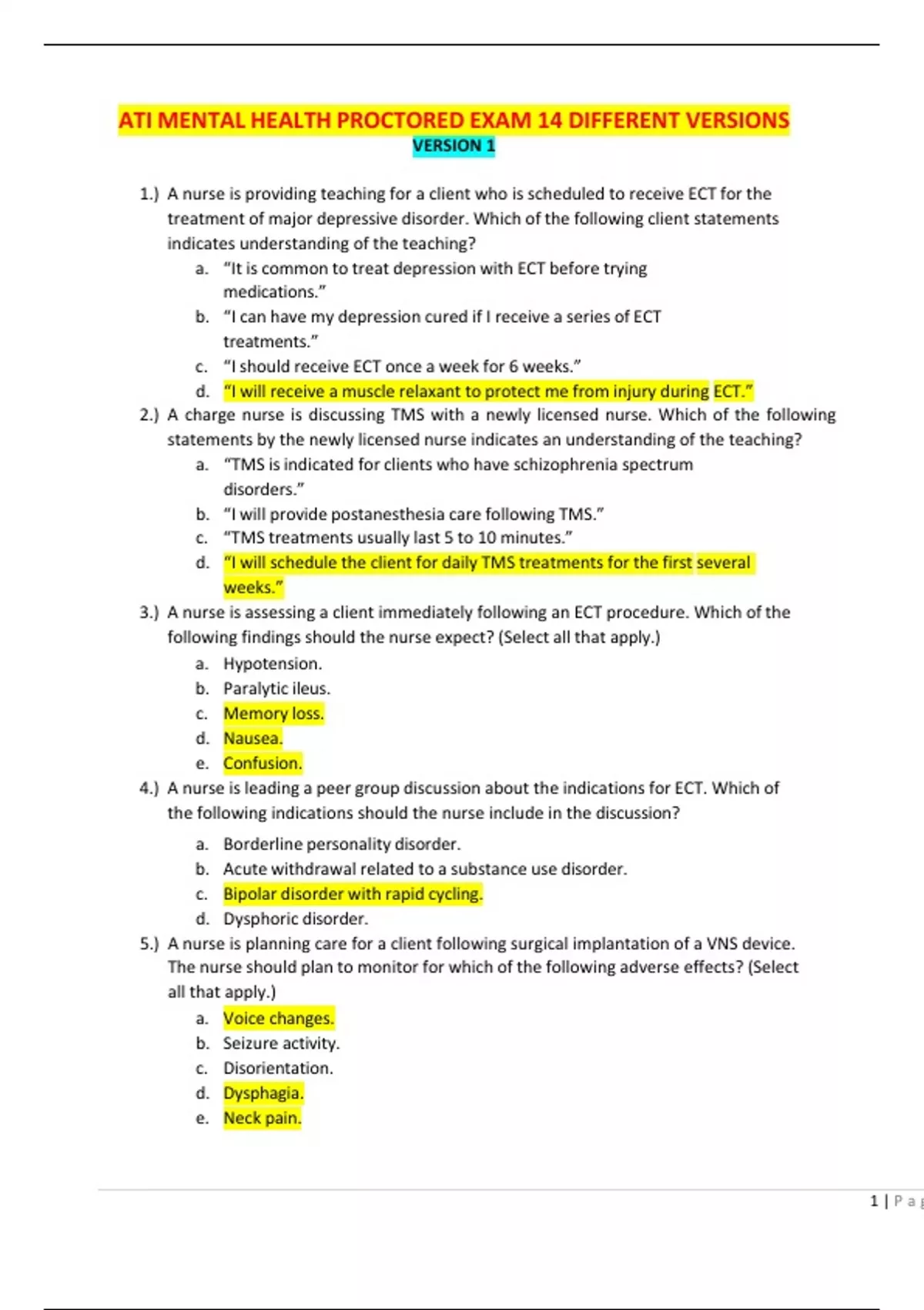 1.) A nurse is providing teaching for a client who is scheduled to receive ECT for the