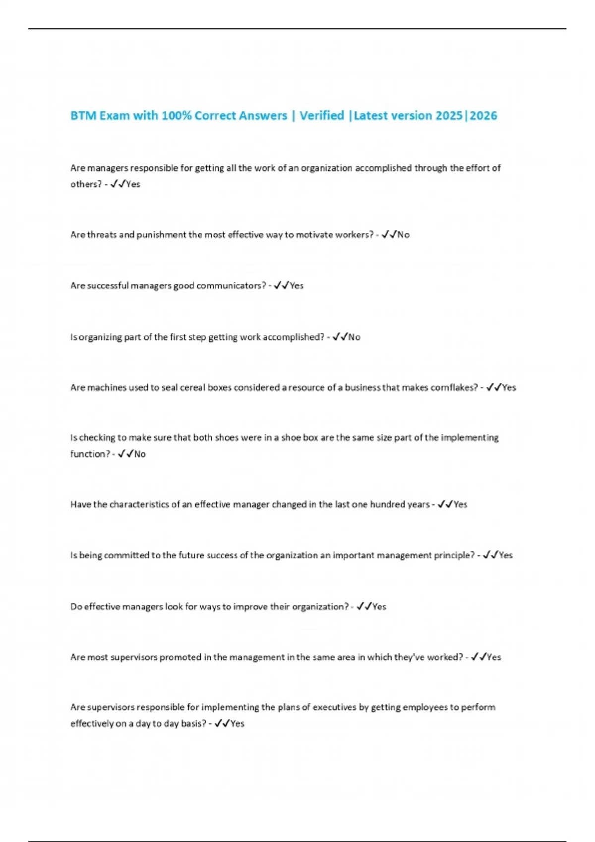 BTM Exam with 100% Correct Answers | Verified |Latest version 2025|2026