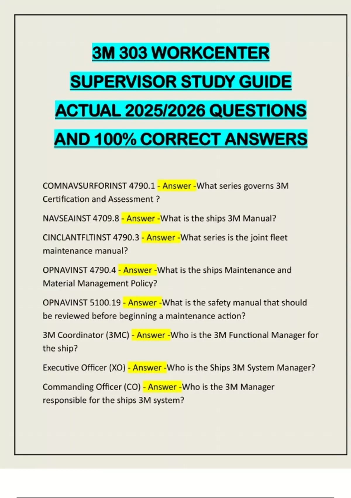3M 303 WORKCENTER SUPERVISOR STUDY GUIDE ACTUAL 2025/2026 QUESTIONS AND 100% CORRECT ANSWERS COMNAVSURFORINST 4790.1 - Answer -What series governs 3M Certification and Assessment ? NAVSEAINST 4709.8 - Answer -What is the ships 3M Manual? CINCLANTFLTINST 4790.3 - Answer -What series is the joint fleet maintenance manual? OPNAVINST 4790.4 - Answer -What is the ships Maintenance and Material Management Policy? OPNAVINST 5100.19 - Answer -What is the safety manual that should be reviewed before beginning a maintenance action? 3M Coordinator (3MC) - Answer -Who is the 3M Functional Manager for the ship? Executive Officer (XO) - Answer -Who is the Ships 3M System Manager? Commanding Officer (CO) - Answer -Who is the 3M Manager responsible for the ships 3M system?Work Center Supervisor - Answer -Who reviews MRCs and promptly submits a PMS TFBR whenever maintenance requirements are not fully understood or errors exist? Work Center Supervisor - Answer -Who schedules weekly Work Center maintenance and supervises its proper accomplishment? Work Center Supervisor - Answer -Who should be immediately notified if there is anything on the MRC that you do not fully understand, when any tools, parts or material listed on the MRC are not available, or if there is any doubt about your ability to properl