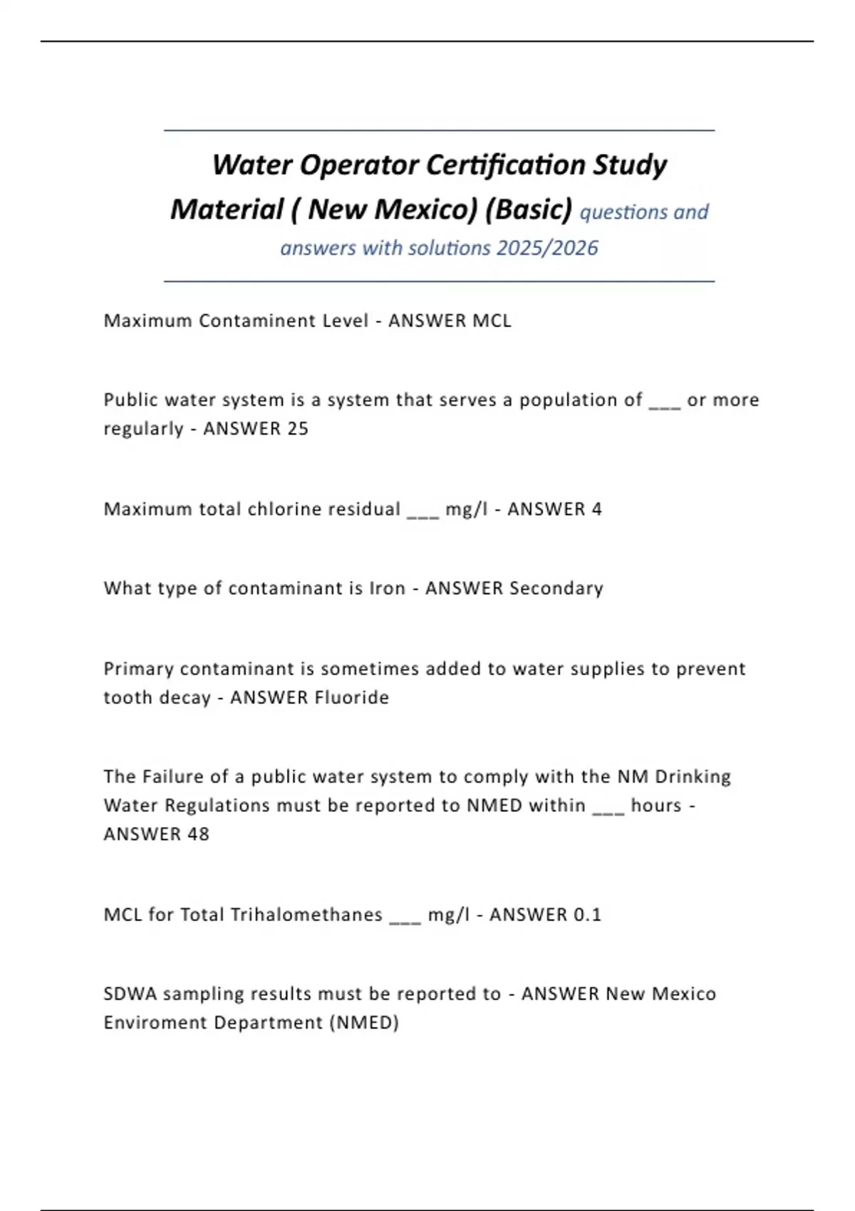 Water Operator Certification Study Material ( New Mexico) (Basic) questions and answers with solutions 2025/2026