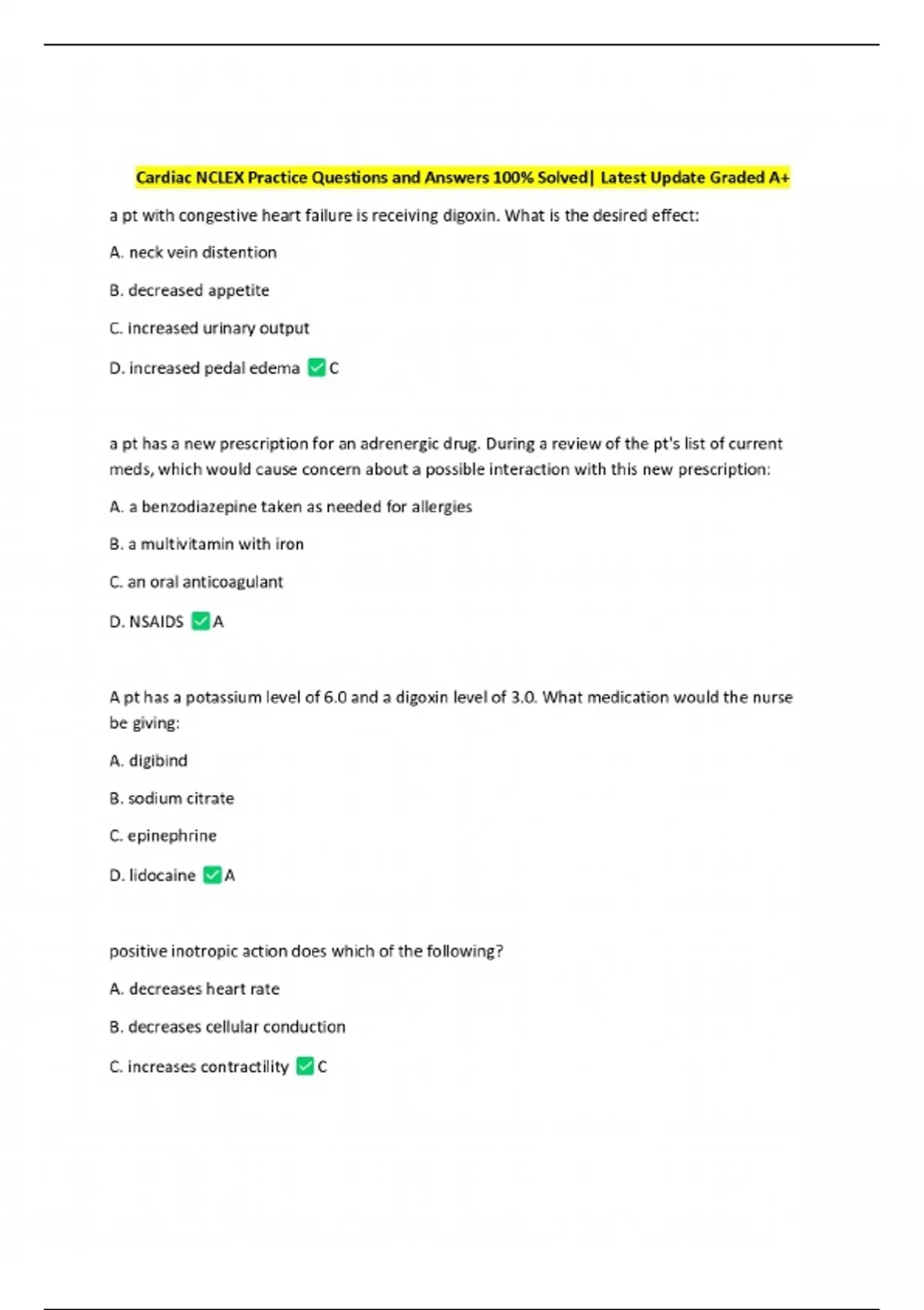 Cardiac NCLEX Practice Questions and Answers 100% Solved| Latest Update Graded A+