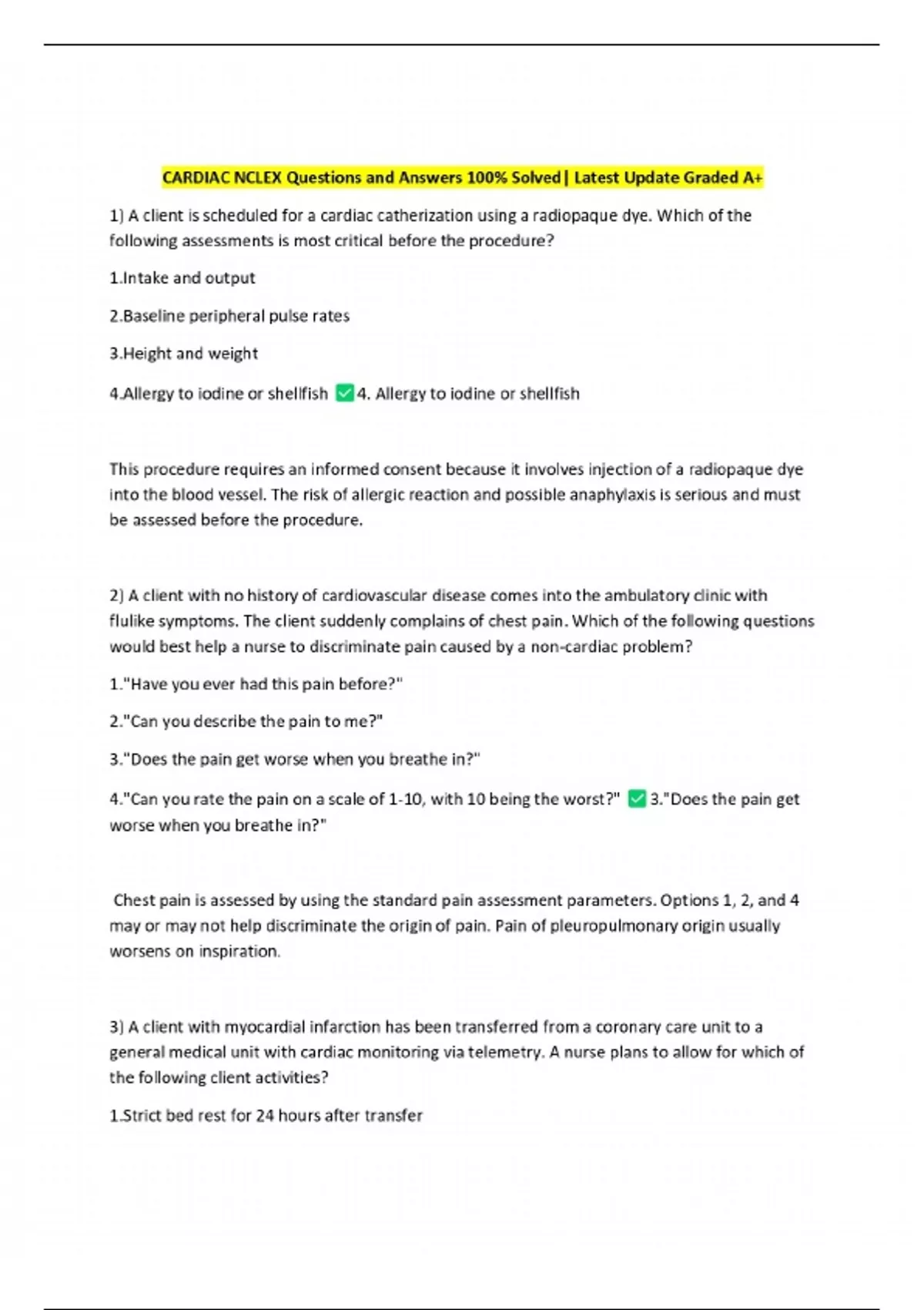 CARDIAC NCLEX Questions and Answers 100% Solved| Latest Update Graded A+