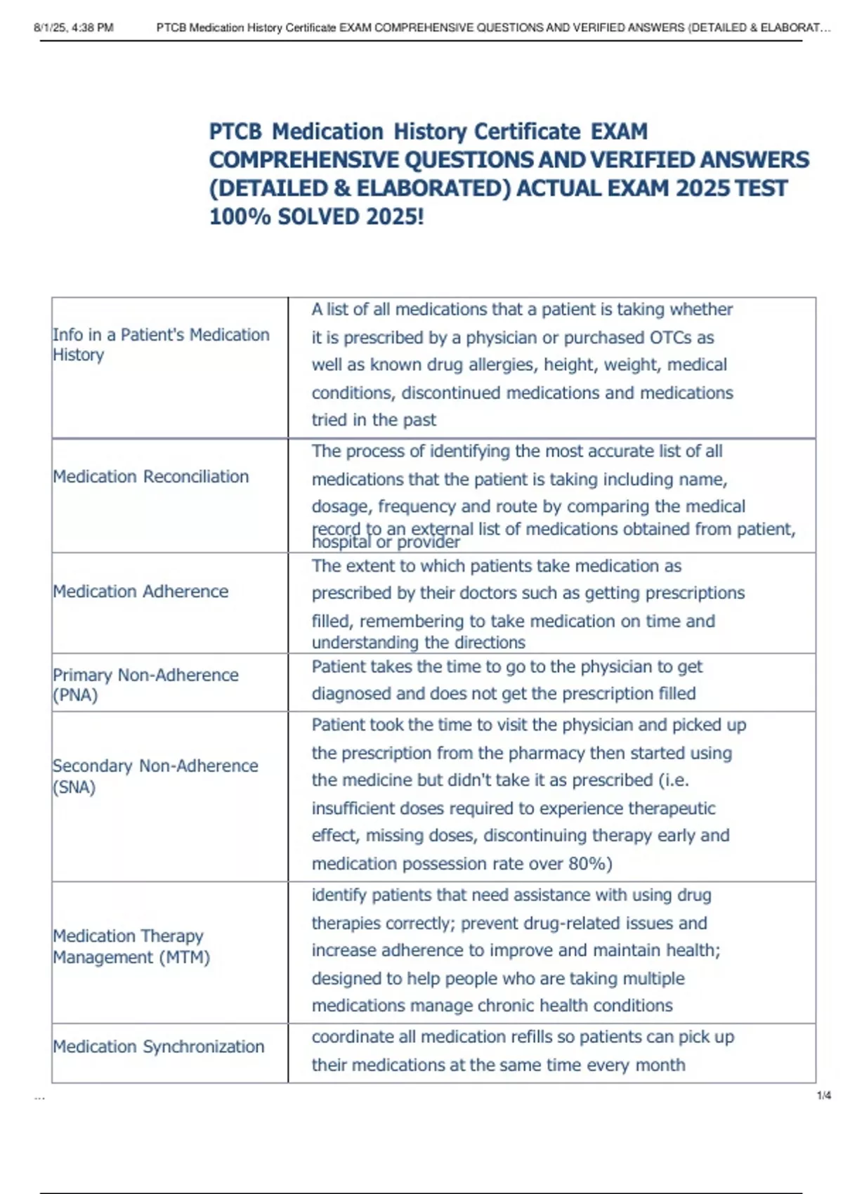 8/1/25, 4:38 PM PTCB Medication History Certificate EXAM COMPREHENSIVE QUESTIONS AND VERIFIED ANSWERS (DETAILED & ELABORAT…