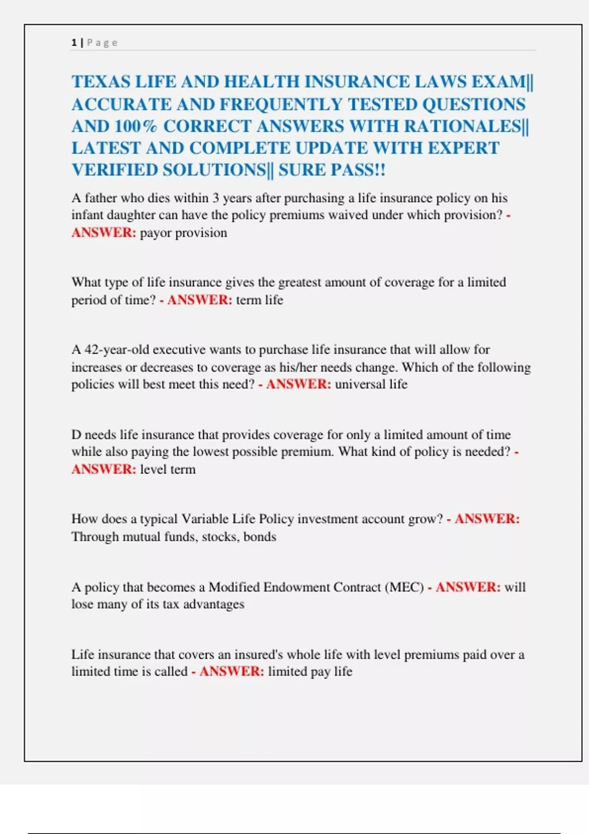TEXAS LIFE AND HEALTH INSURANCE LAWS EXAM||