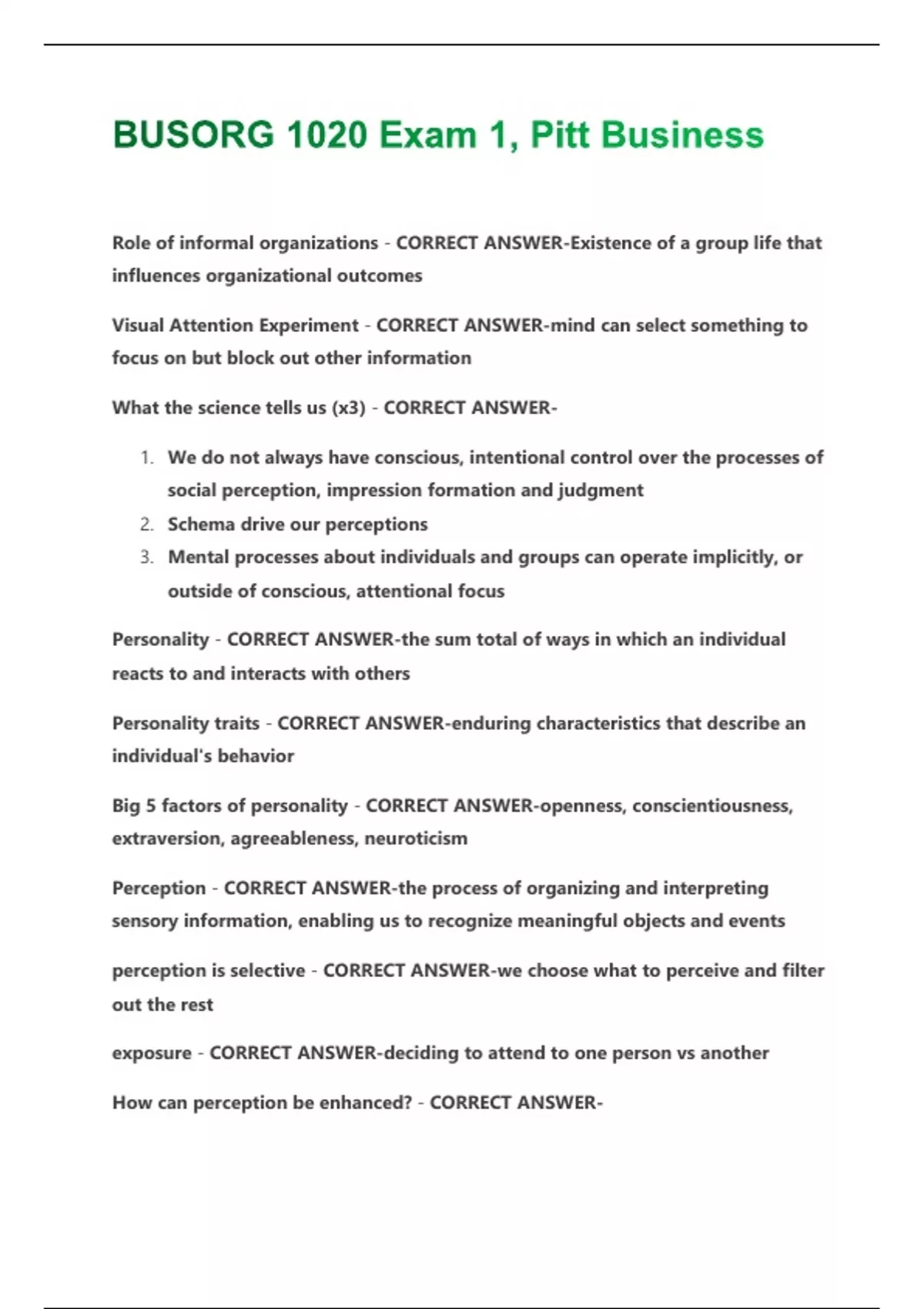 Role of informal organizations - CORRECT ANSWER-Existence of a group life that influences organizational outcomes Visual Attention Experiment - CORRECT ANSWER-mind can select something to focus on but block out other information What the science tells us (x3) - CORRECT ANSWER- 1. We do not always have conscious, intentional control over the processes of social perception, impression formation and judgment 2. Schema drive our perceptions 3. Mental processes about individuals and groups can operate implicitly, or outside of conscious, attentional focus Personality - CORRECT ANSWER-the sum total of ways in which an individual reacts to and interacts with others Personality traits - CORRECT ANSWER-enduring characteristics that describe an individual's behavior Big 5 factors of personality - CORRECT ANSWER-openness, conscientiousness, extraversion, agreeableness, neuroticism Perception - CORRECT ANSWER-the process of organizing and interpreting sensory information, enabling us to recognize meaningful objects and events perception is selective - CORRECT ANSWER-we choose what to perceive and filter out the rest exposure - CORRECT ANSWER-deciding to attend to one person vs another How can perception be enhanced? - CORRECT ANSWER1. Can be enhanced through intensity of stimulus 2. Can be enhanced through frequency Consensus - CORRECT ANSWER-the degree to which other people in the same situation behave in the same manner