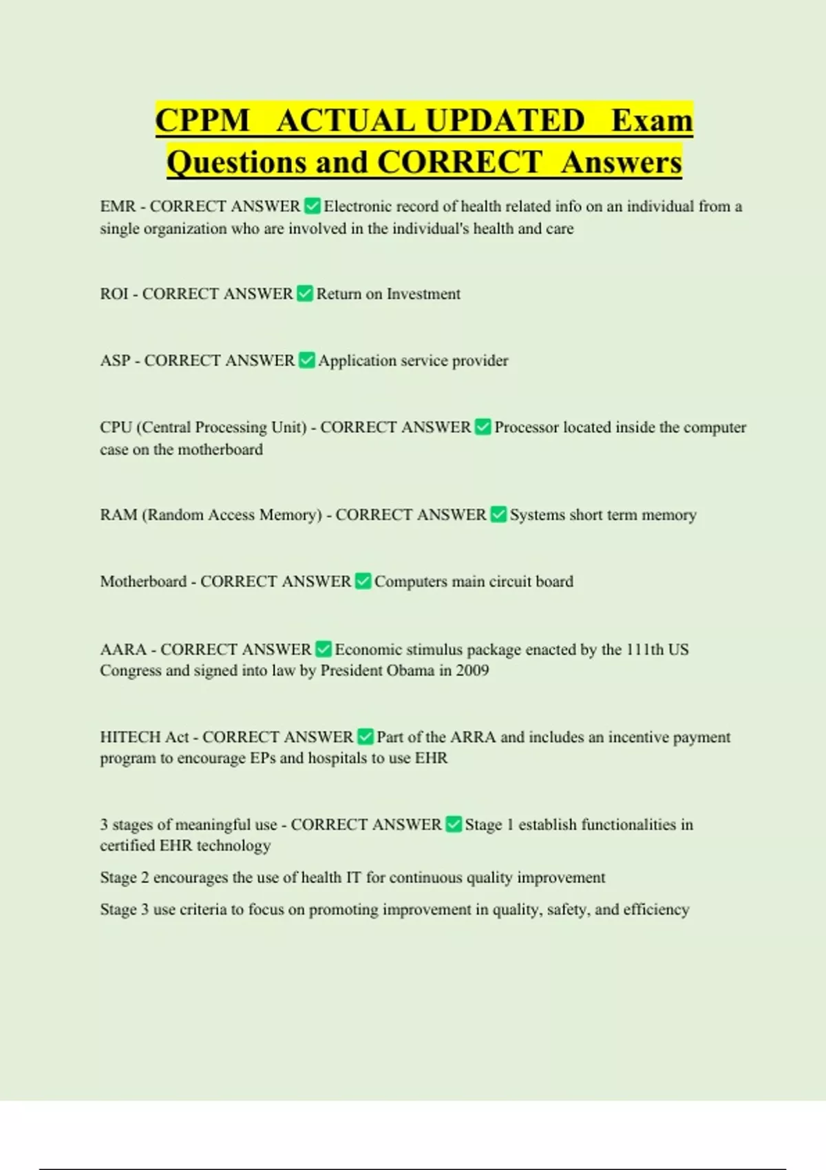 CPPM ACTUAL UPDATED Exam Questions and CORRECT Answers EMR - CORRECT ANSWER Electronic record of health related info on an individual from a single organization who are involved in the individual's health and care ROI - CORRECT ANSWER Return on Investment ASP - CORRECT ANSWER Application service provider CPU (Central Processing Unit) - CORRECT ANSWER Processor located inside the comp