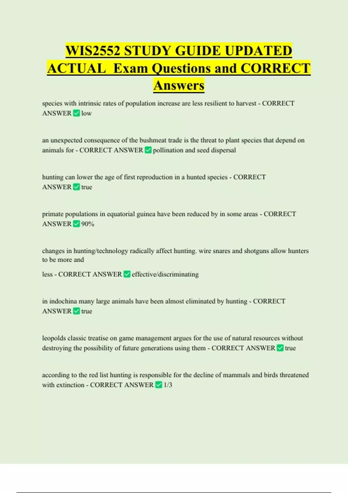 WIS2552 STUDY GUIDE UPDATED ACTUAL Exam Questions and CORRECT Answers species with intrinsic rates of population increase are less resilient to harvest - CORRECT ANSWER low an unexpected consequence of the bushmeat trade is the threat to plant species that depend on animals for - CORRECT ANSWER pollination and seed dispersal hunting can lower the age of first reproduction in a hunted species - CORRECT ANSWER true primate populations in equatorial guinea have been reduced by in some areas - CORRECT ANSWER 90%