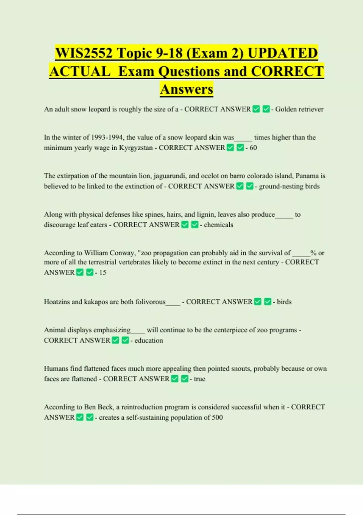 WIS2552 Topic 9-18 (Exam 2) UPDATED ACTUAL Exam Questions and CORRECT Answers An adult snow leopard is roughly the size of a - CORRECT ANSWER - Golden retriever In the winter of , the value of a snow leopard skin was_____ times higher than the minimum yearly wage in Kyrgyzstan - CORRECT ANSWER - 60 The extirpation of the mountain lion, jaguarundi, and ocelot on barro colorado island, Panama is believed to be linked to the extinction of - CORRECT ANSWER - ground-nesting birds Along with physical defenses like spines, hairs, and lignin, leaves also produce_____ to discourage leaf eaters - CORRECT ANSWER - chemicals