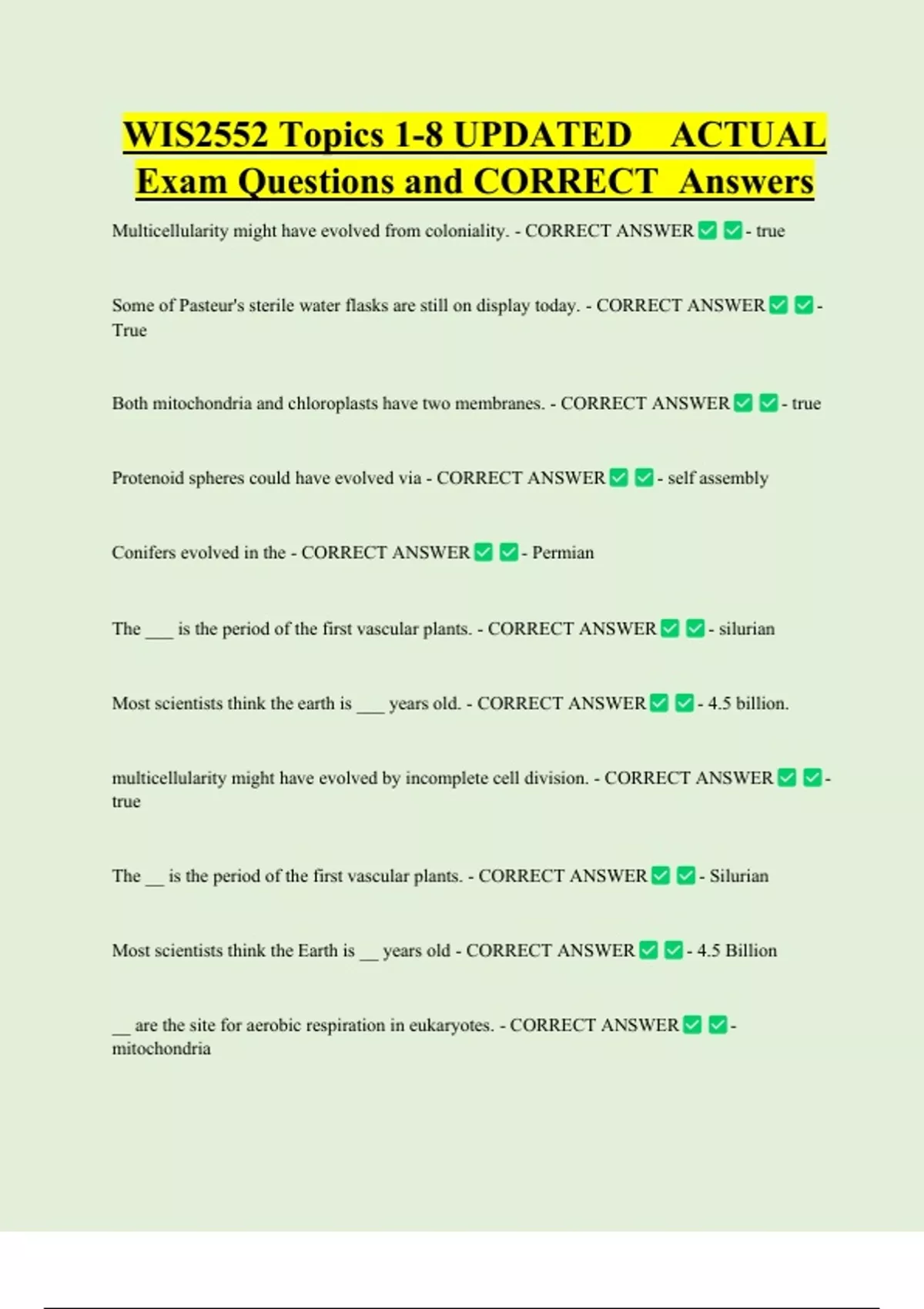 WIS2552 Topics 1-8 UPDATED ACTUAL Exam Questions and CORRECT Answers Multicellularity might have evolved from coloniality. - CORRECT ANSWER - true Some of Pasteur's sterile water flasks are still on display today. - CORRECT ANSWER True Both mitochondria and chloroplasts have two membranes. - CORRECT ANSWER - - true Protenoid spheres could have evolved via - CORRECT ANSWER Conifers evolved in the - CORRECT ANSWER - Permian