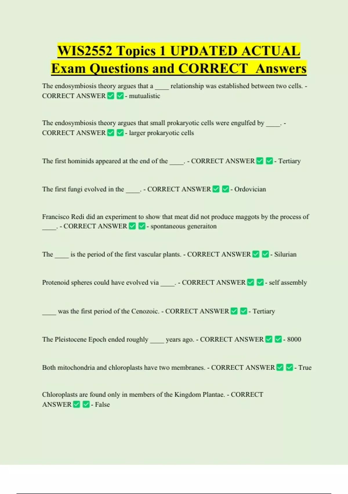 WIS2552 Topics 1 UPDATED ACTUAL Exam Questions and CORRECT Answers The endosymbiosis theory argues that a ____ relationship was established between two cells. - CORRECT ANSWER - mutualistic The endosymbiosis theory argues that small prokaryotic cells were engulfed by ____. - CORRECT ANSWER - larger prokaryotic cells The first hominids appeared at the end of the ____. - CORRECT ANSWER The first fungi evolved in the ____. - CORRECT ANSWER - Ordovicia