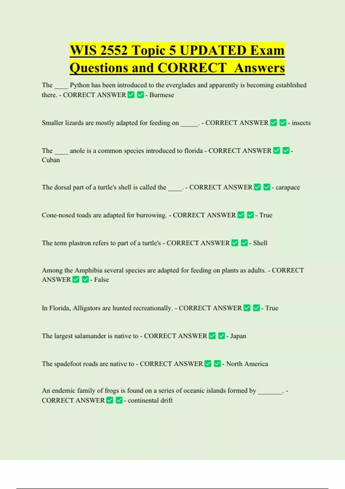 WIS 2552 Topic 5 UPDATED Exam Questions and CORRECT Answers The ____ Python has been introduced to the everglades and apparently is becoming established there. - CORRECT ANSWER - Burmese Smaller lizards are mostly adapted for feeding on _____. - CORRECT ANSWER The ____ anole is a common species introduced to florida - CORRECT ANSWER Cuban The dorsal part of a turtle's shell is called the ____. - CORRECT ANSWER - insects - - carapace